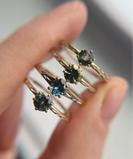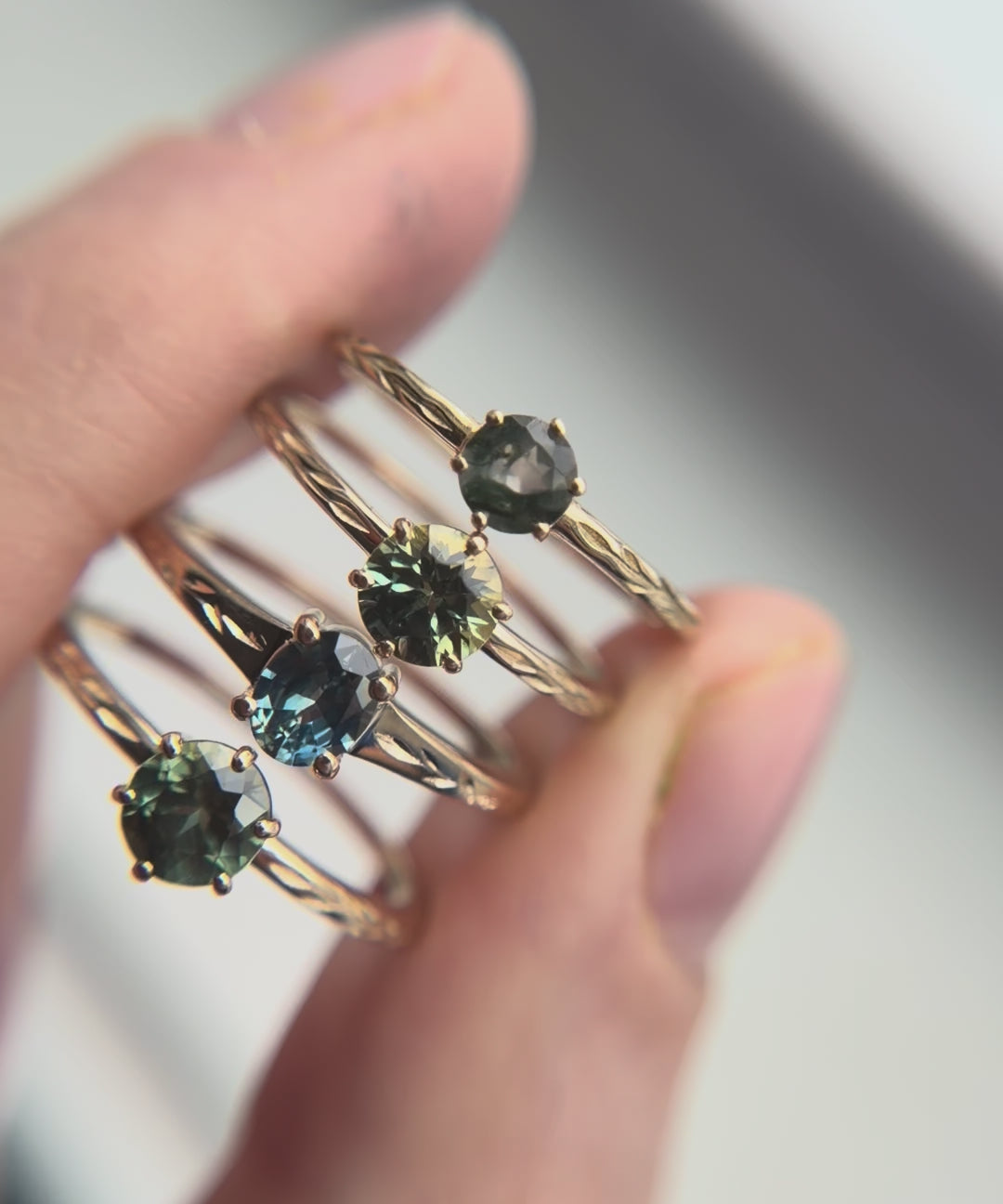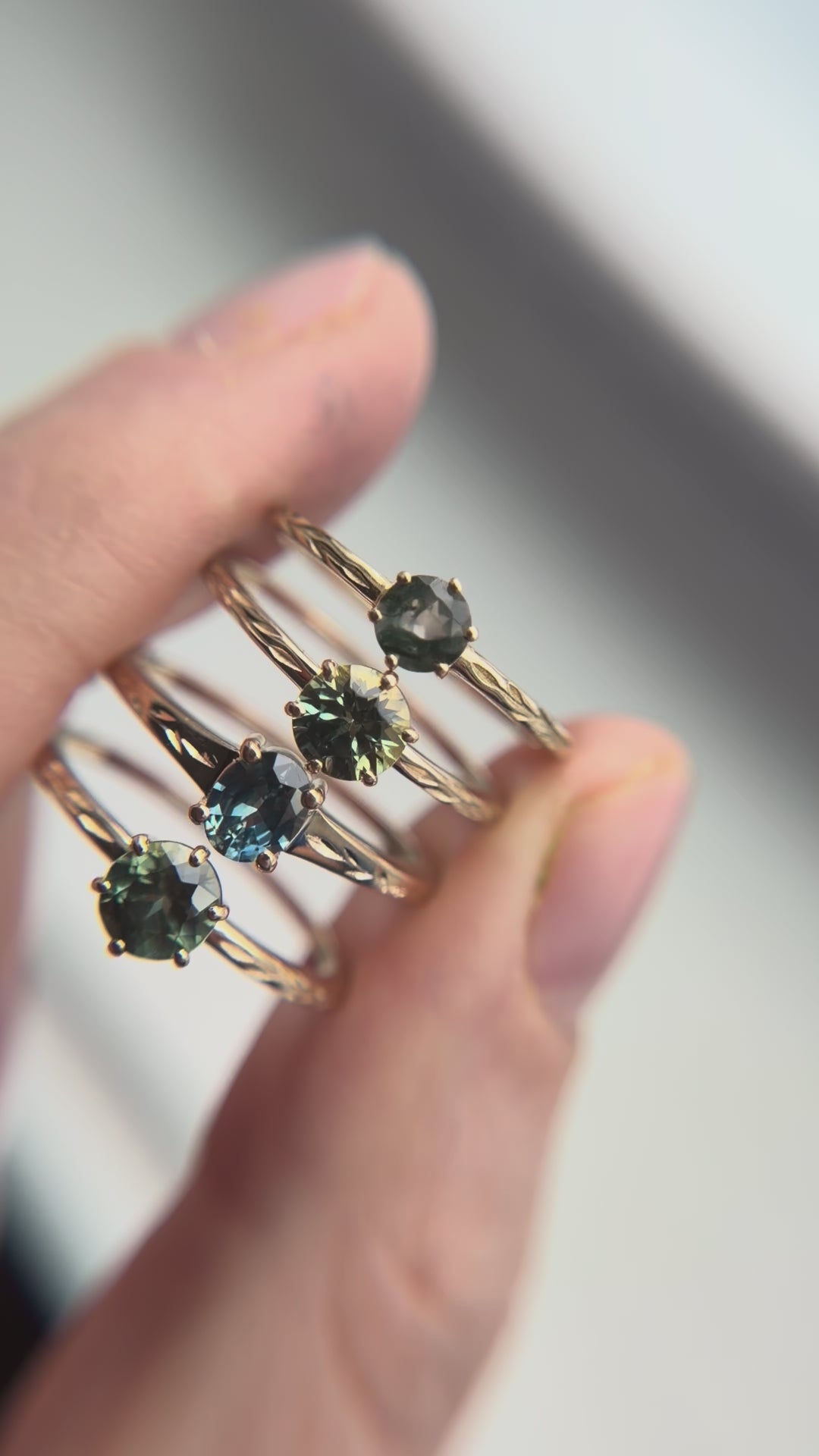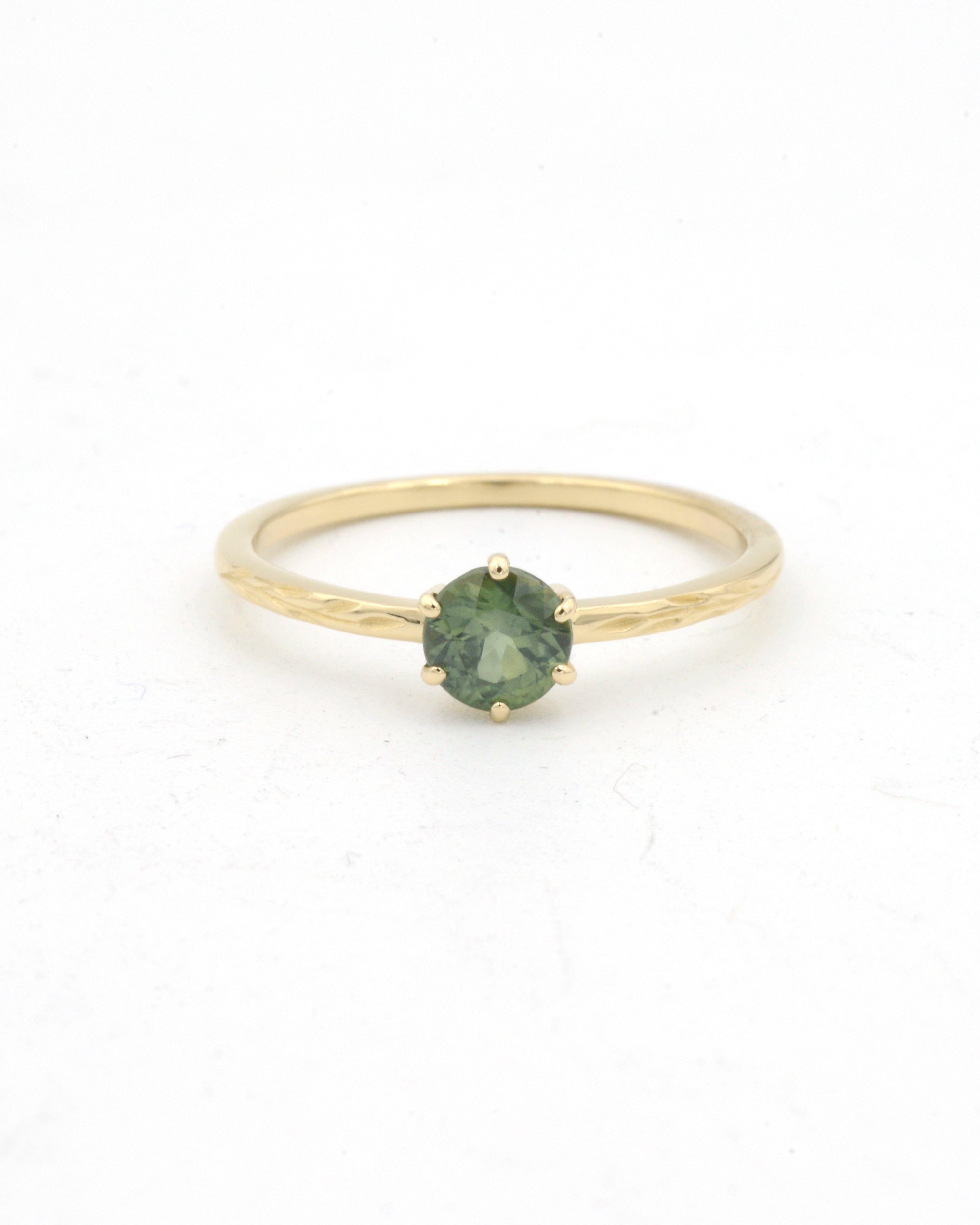 This Perse Ring is set with a one of a kind 5mm green Australian sapphire in a 14k yellow gold band with olive branch engravings on either side.