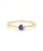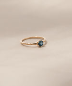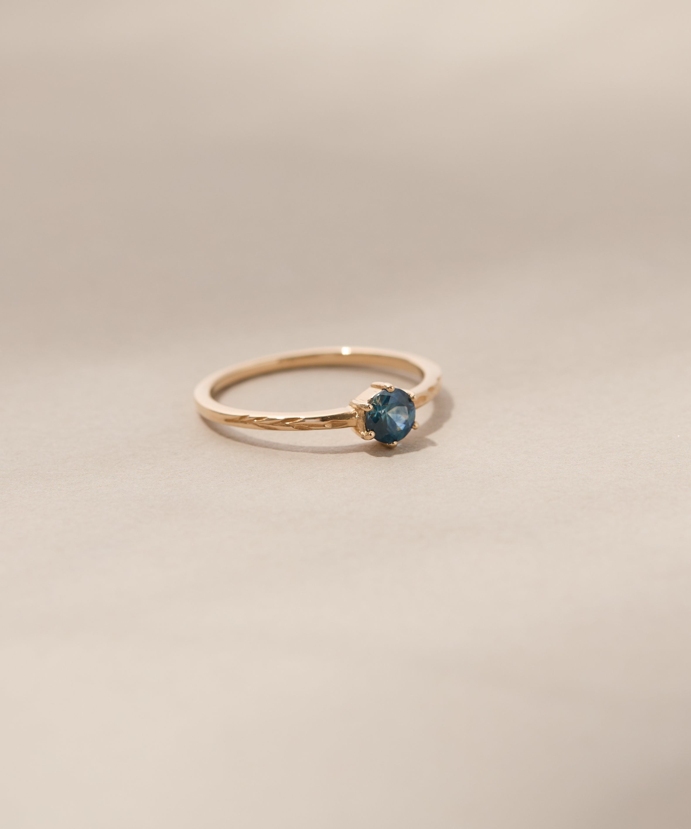 A dark teal round Montana sapphire prong set in a delicate band with olive branch engravings on either side.