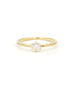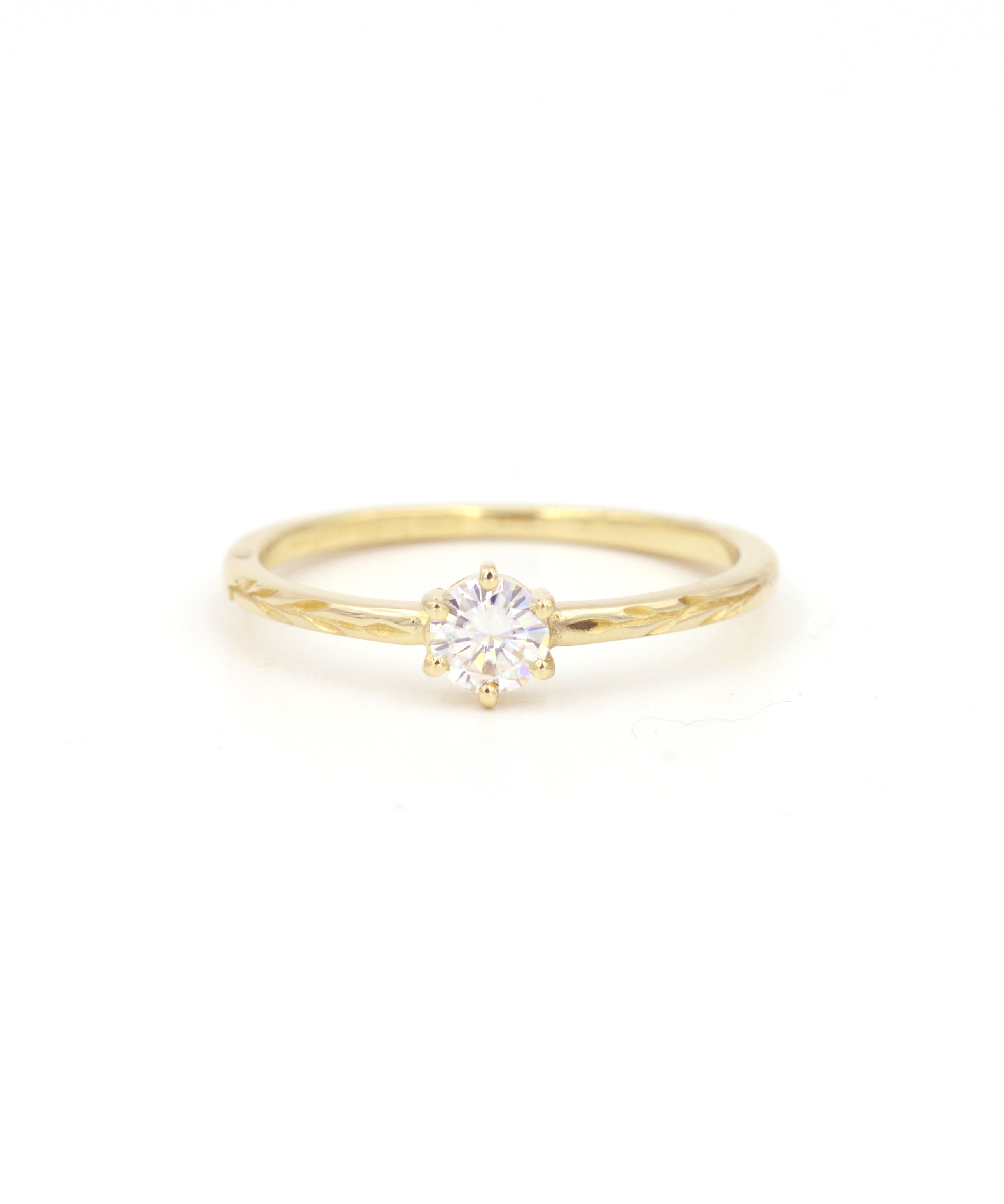 A forever one moissanite prong set in a delicate band with olive branch engravings on either side.