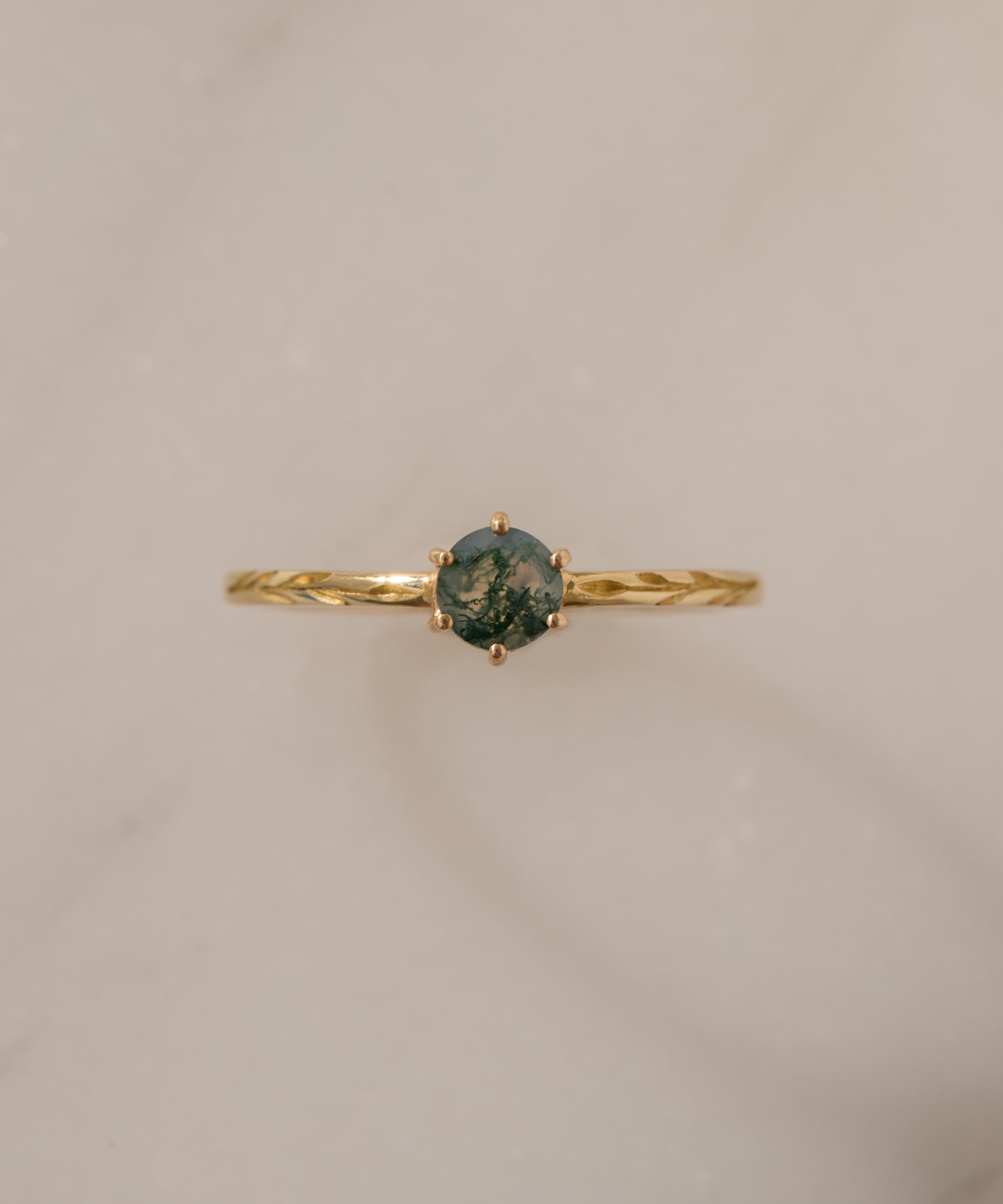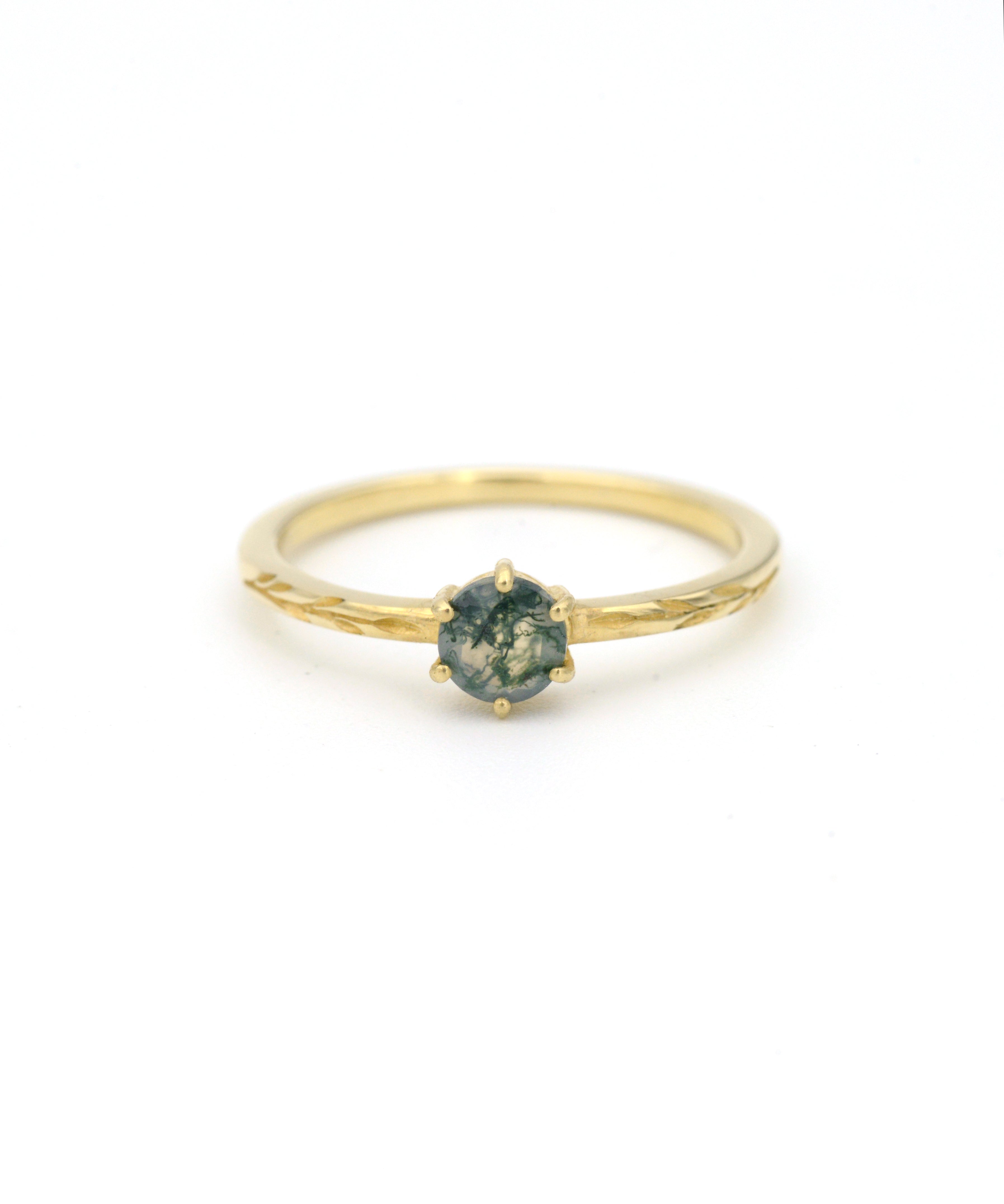 A unique round moss agate prong set in a delicate band with olive branch engravings on either side.