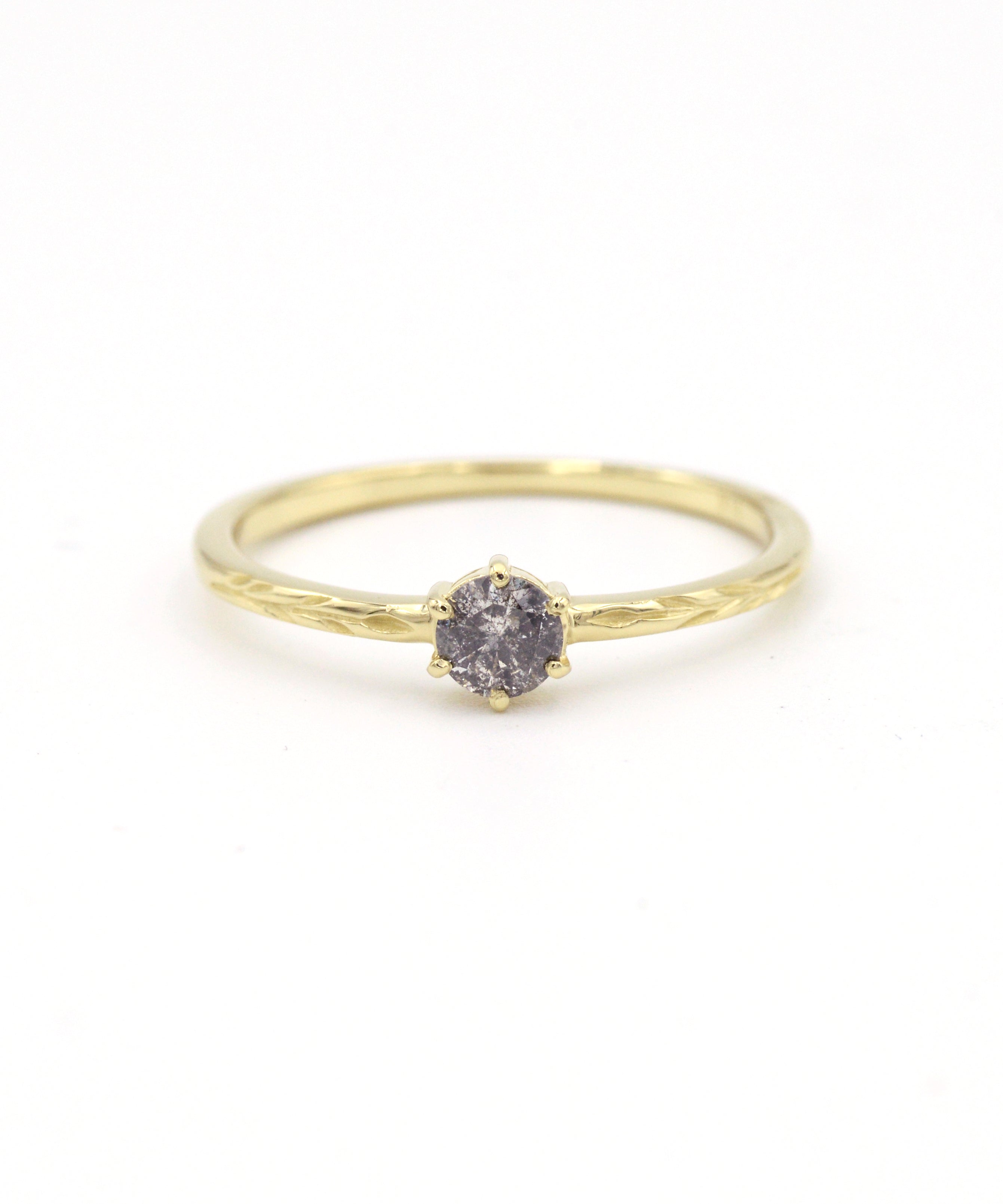 A round salt and pepper diamond prong set in a delicate band with olive branch engravings on either side.