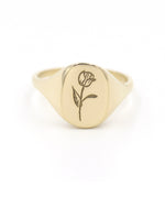 Our classic oval signet ring, a bold face with a dainty band, engraved with a tulip.