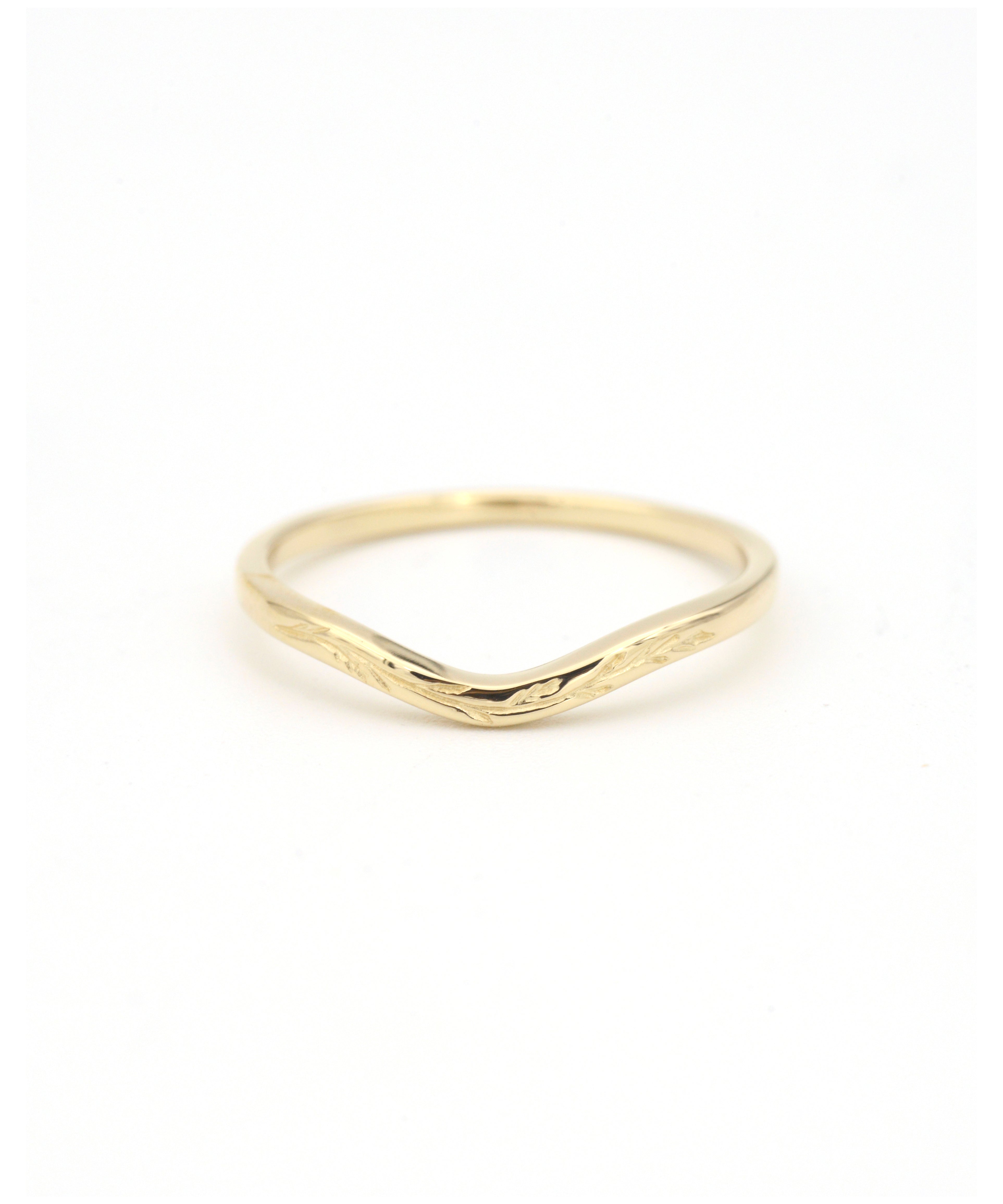 A curved band engraved with a leafy engraving. Perfect for nestling with an engagement ring.