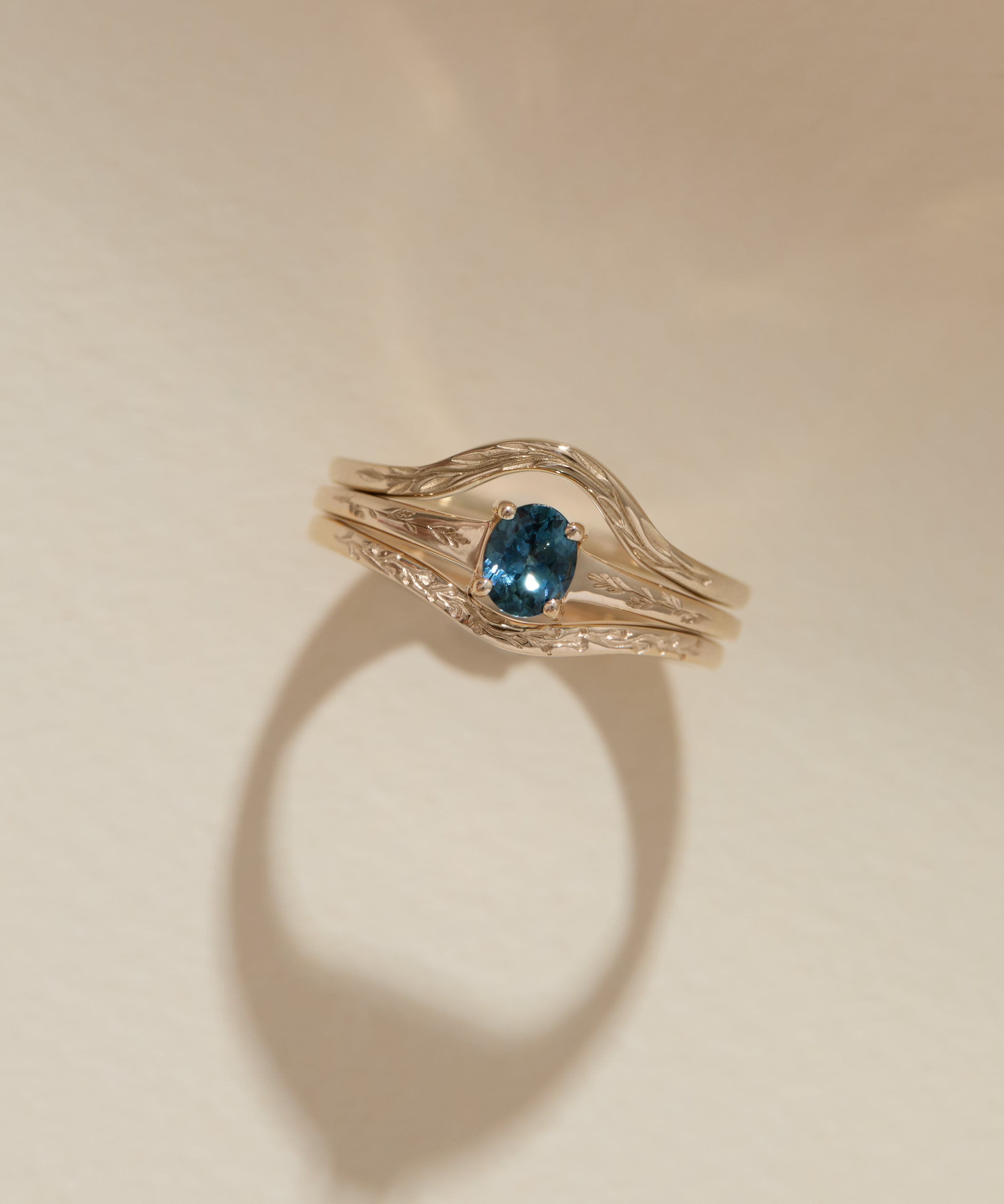 A deeply curved band with our signature olive branch engraving. Perfect for nesting with larger center stones, or our mini signet rings.