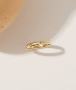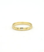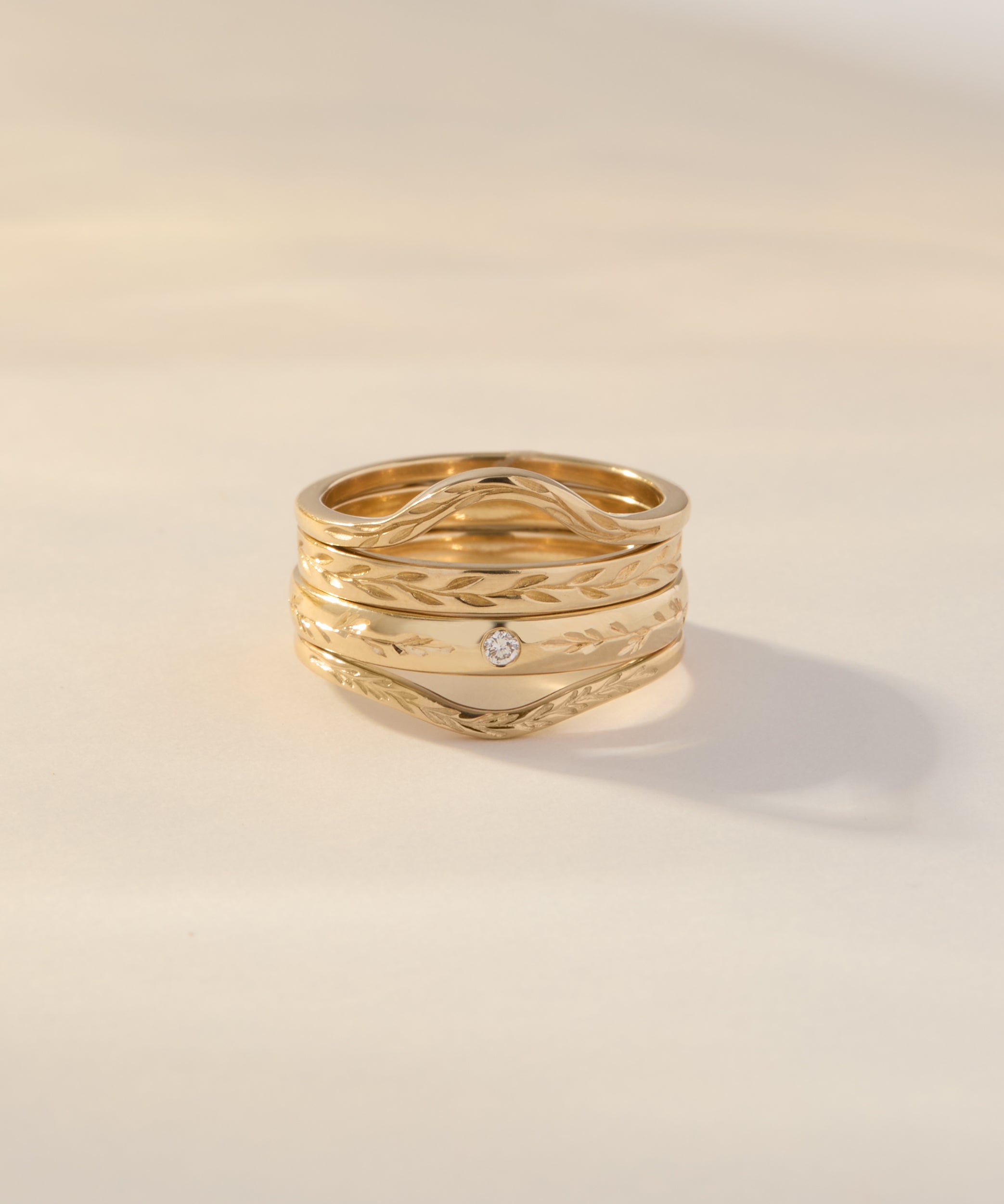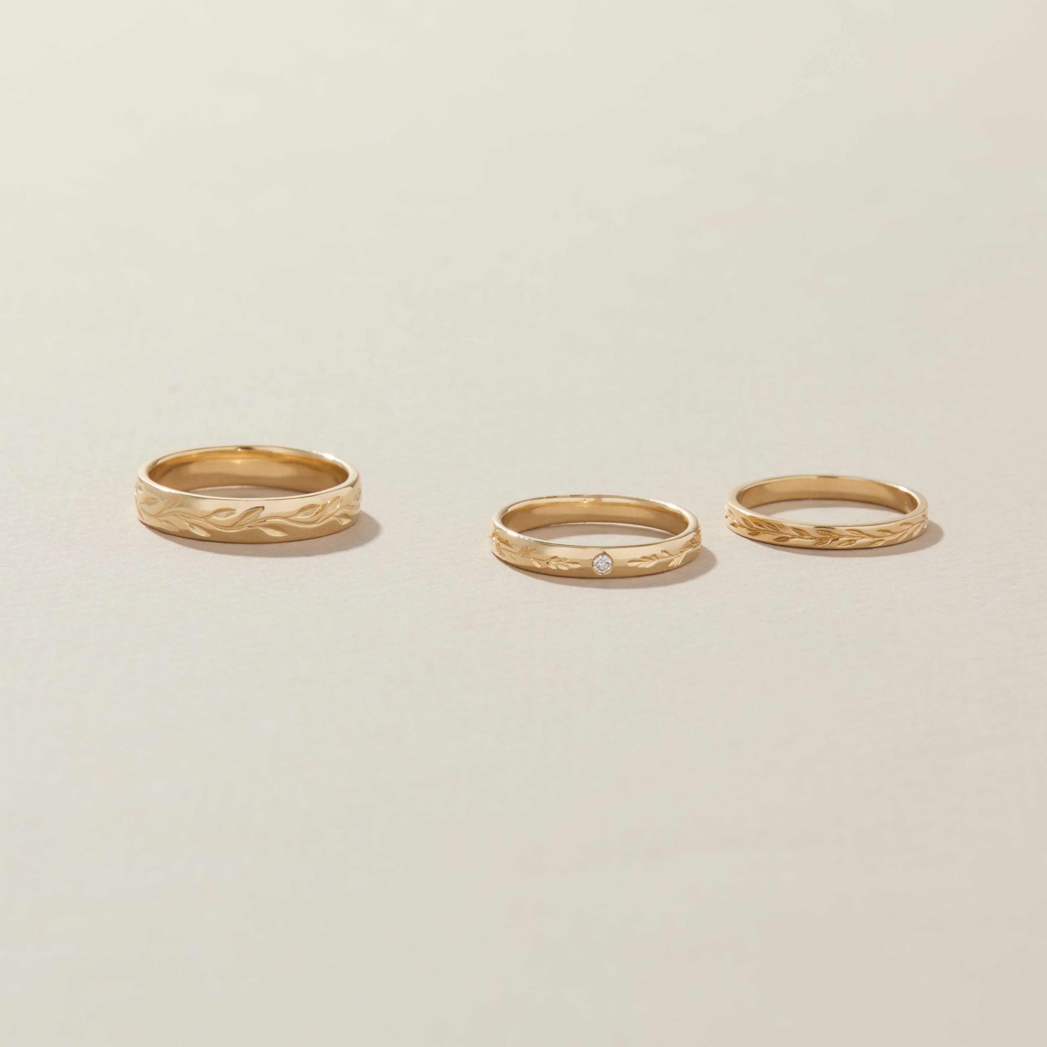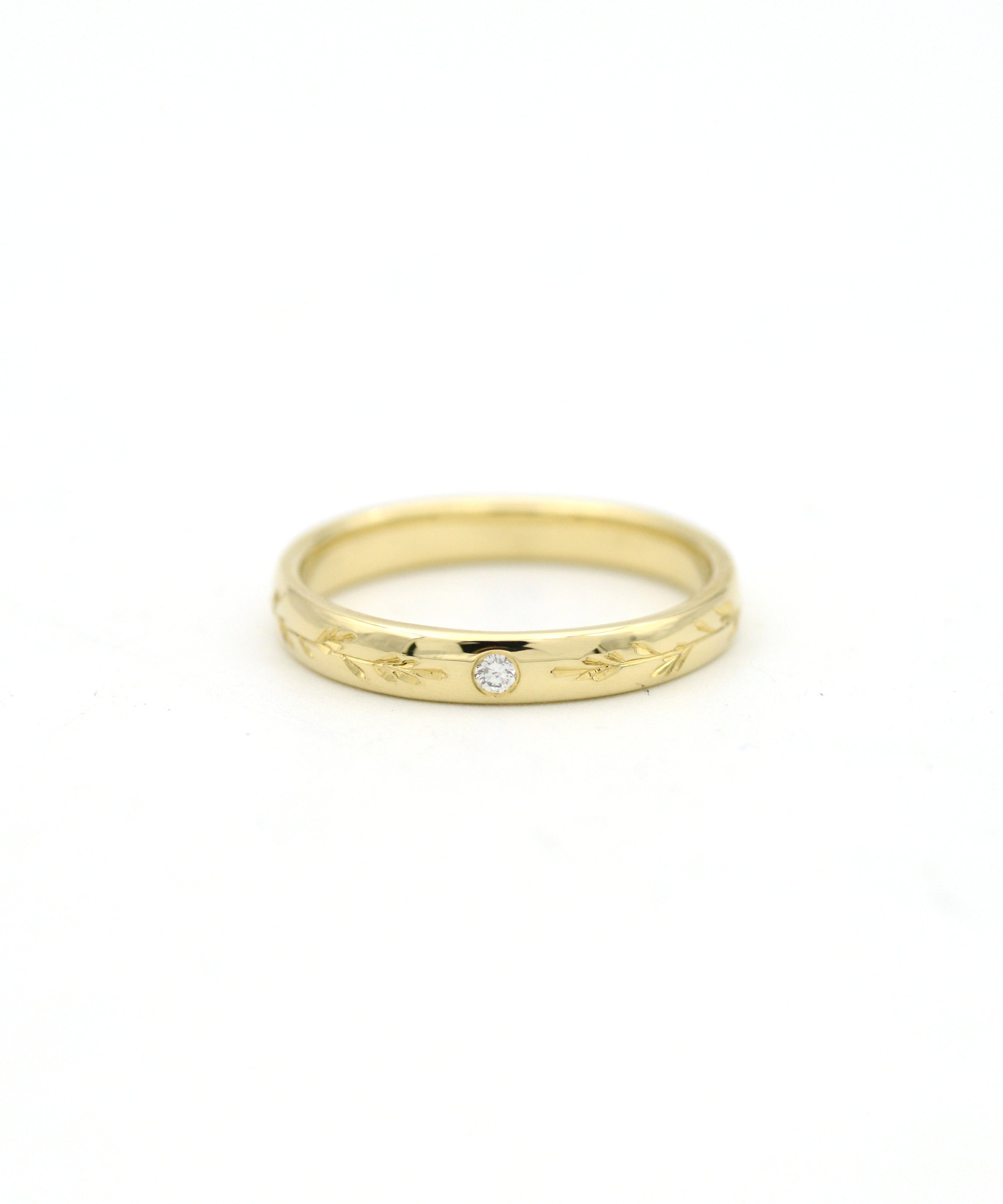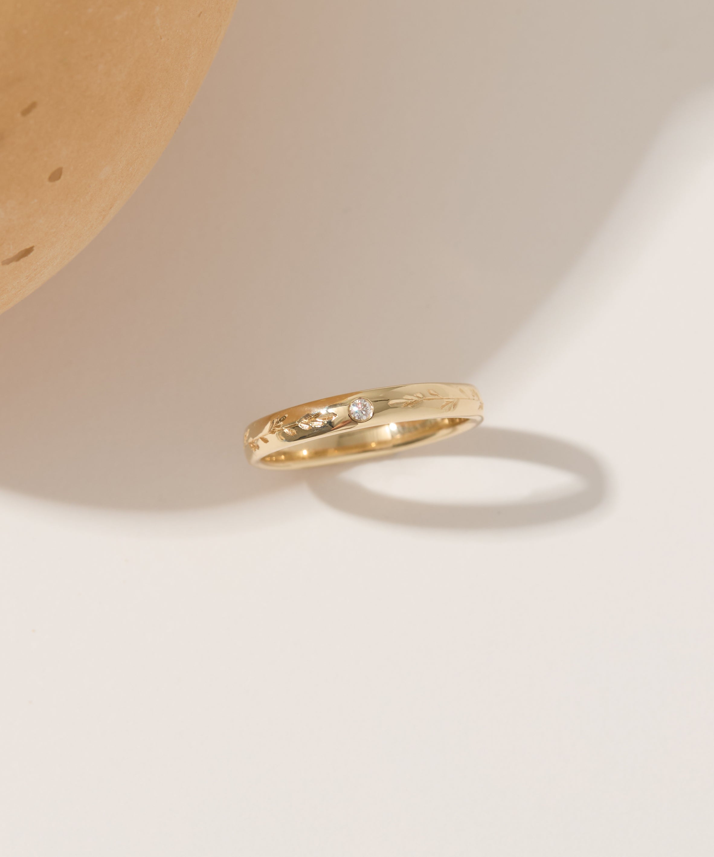 A 3mm band with a flush set white diamond, hand engraved with our signature leafy design on either side.