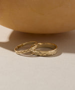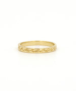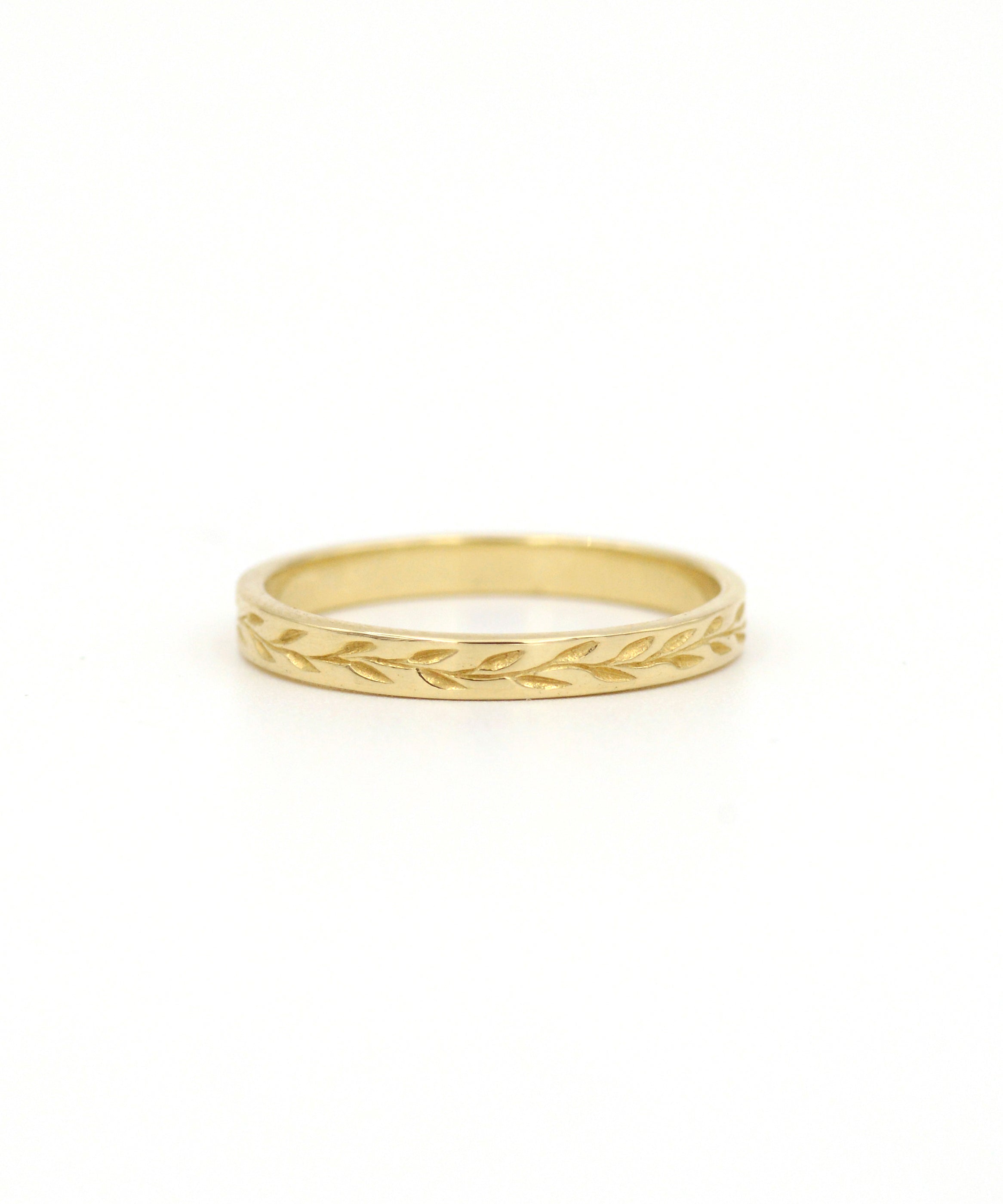 A simple, flat band with an olive branch engraving wrapping all the way around.