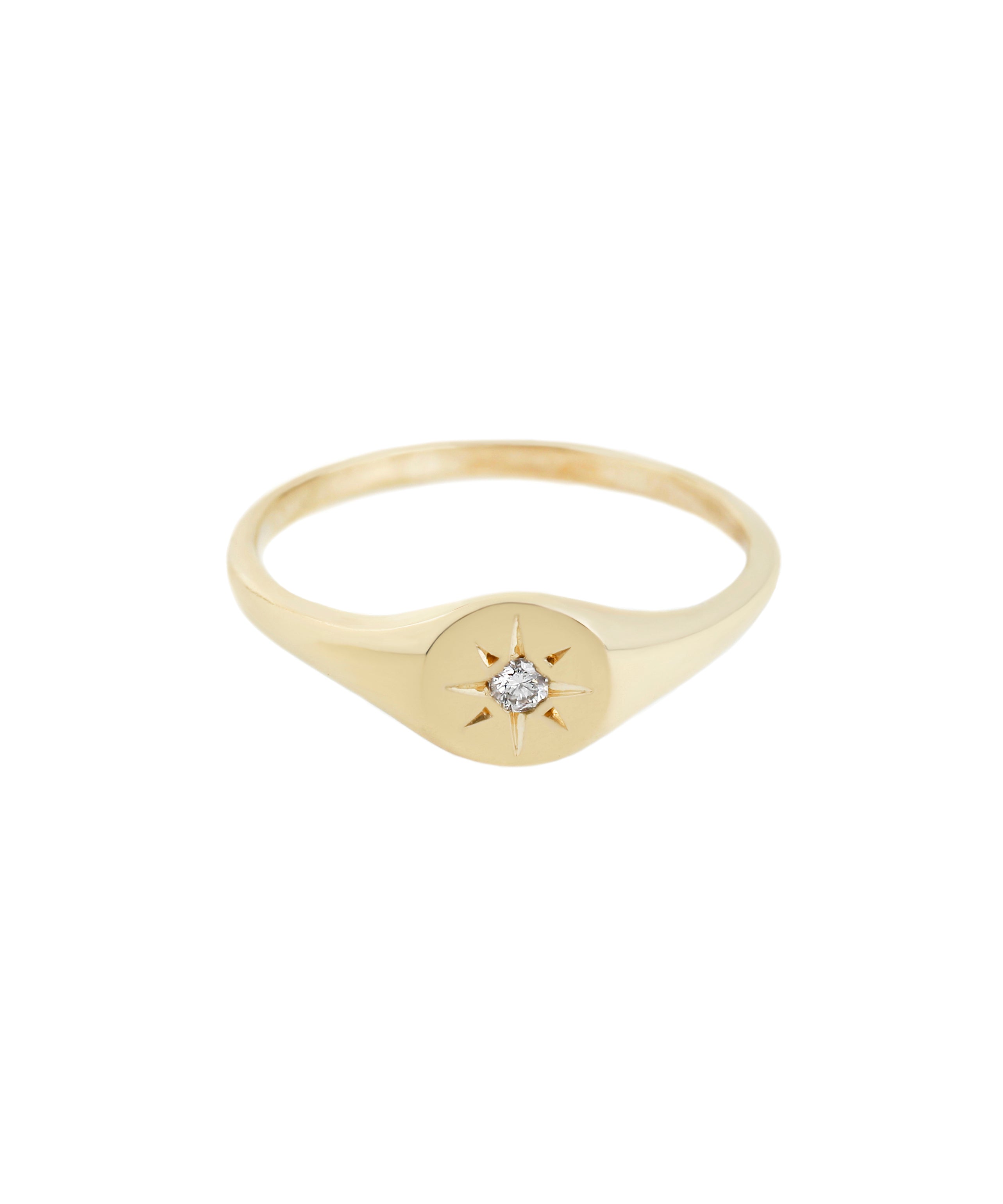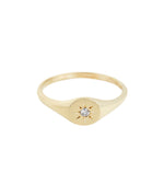 A dainty signet ring with a soft circular face, star set with a white diamond.