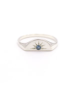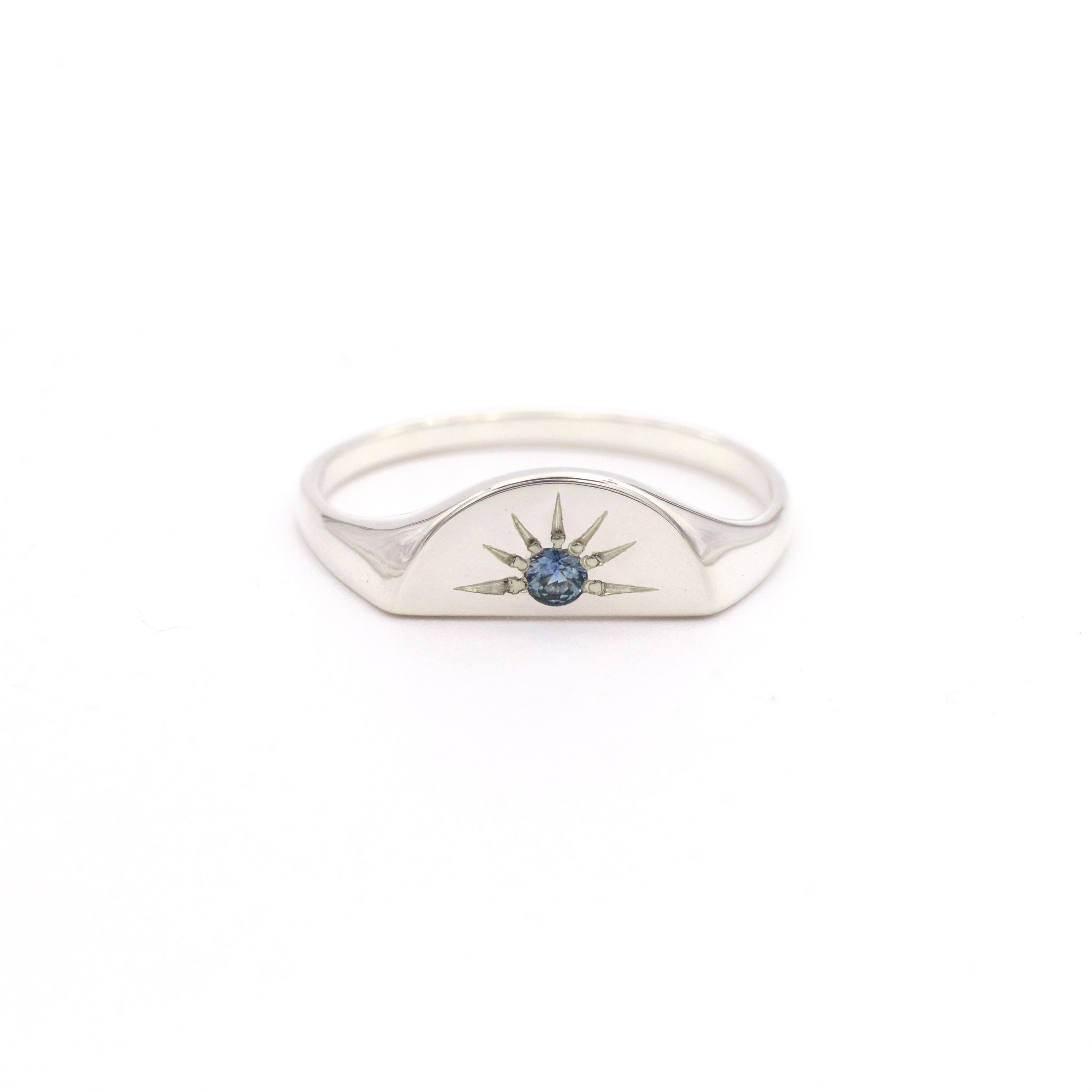 A signet ring with a half moon face, star set with a montana sapphire, perfect for stacking or wearing alone.