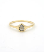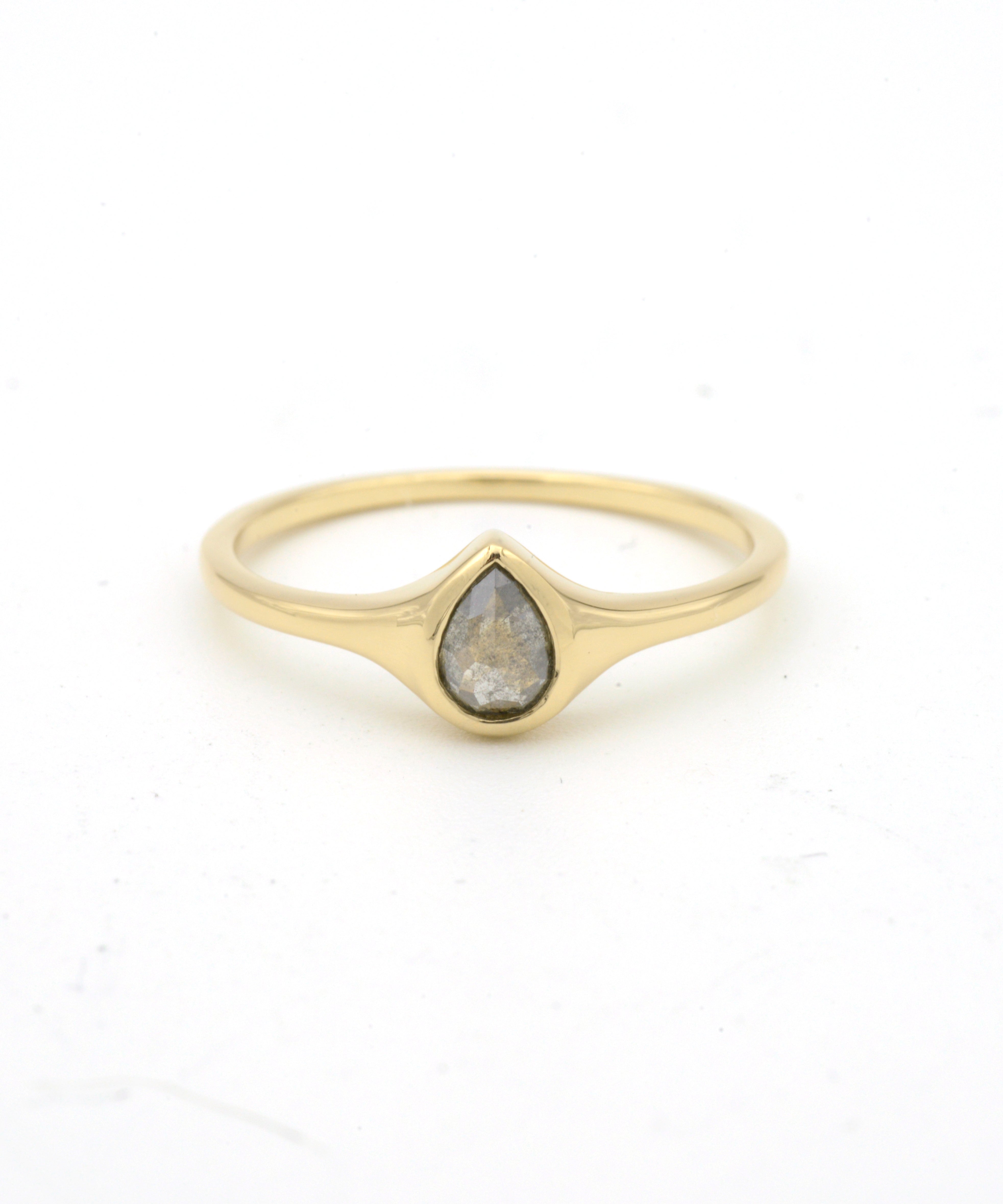 A pear shaped salt and pepper rosecut diamond set in a signet style, low profile setting.