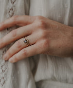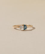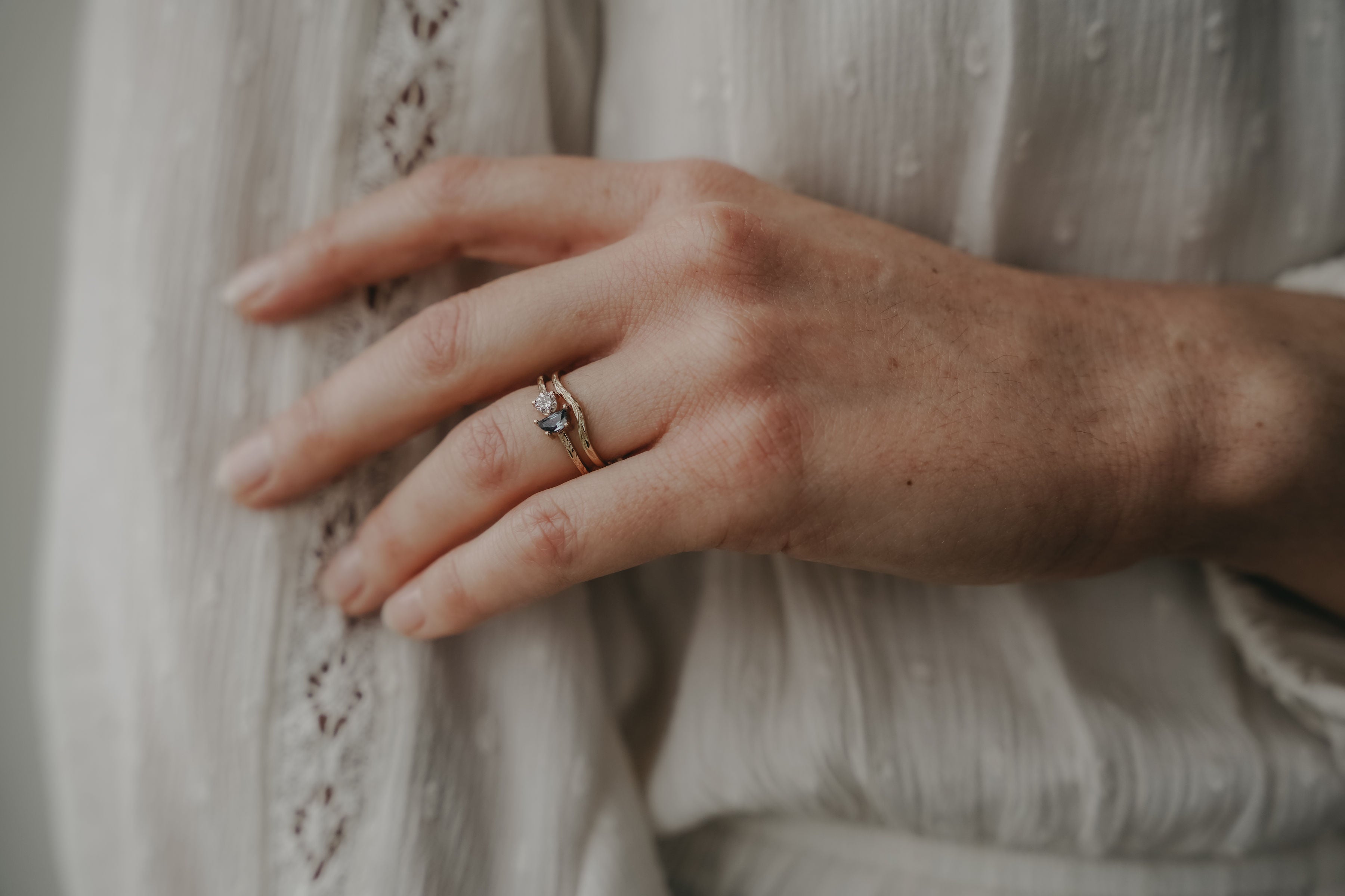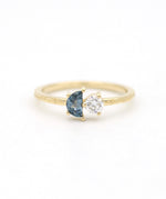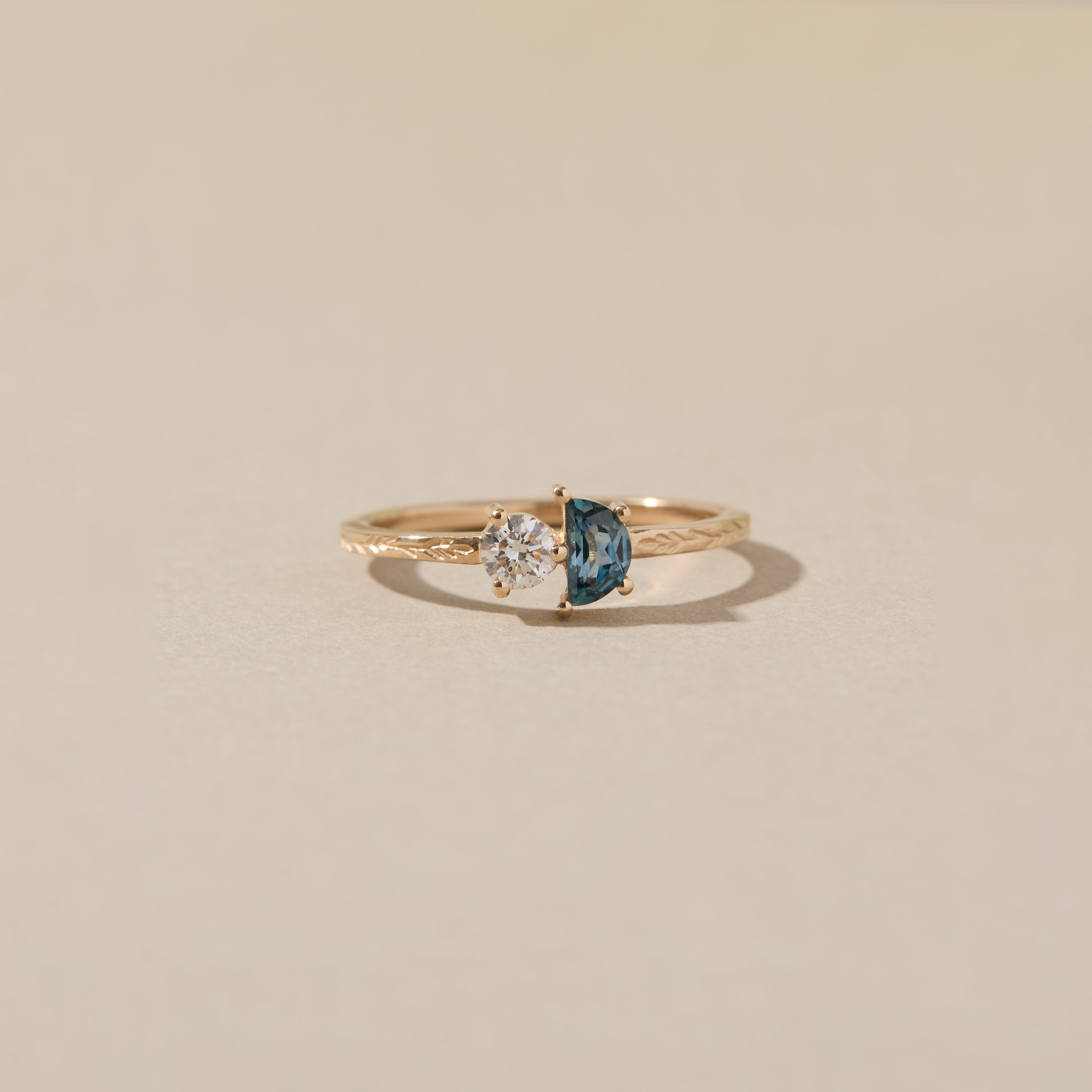 A teal Montana sapphire and white diamond set in a delicate band with olive branch engravings on either side.