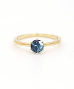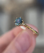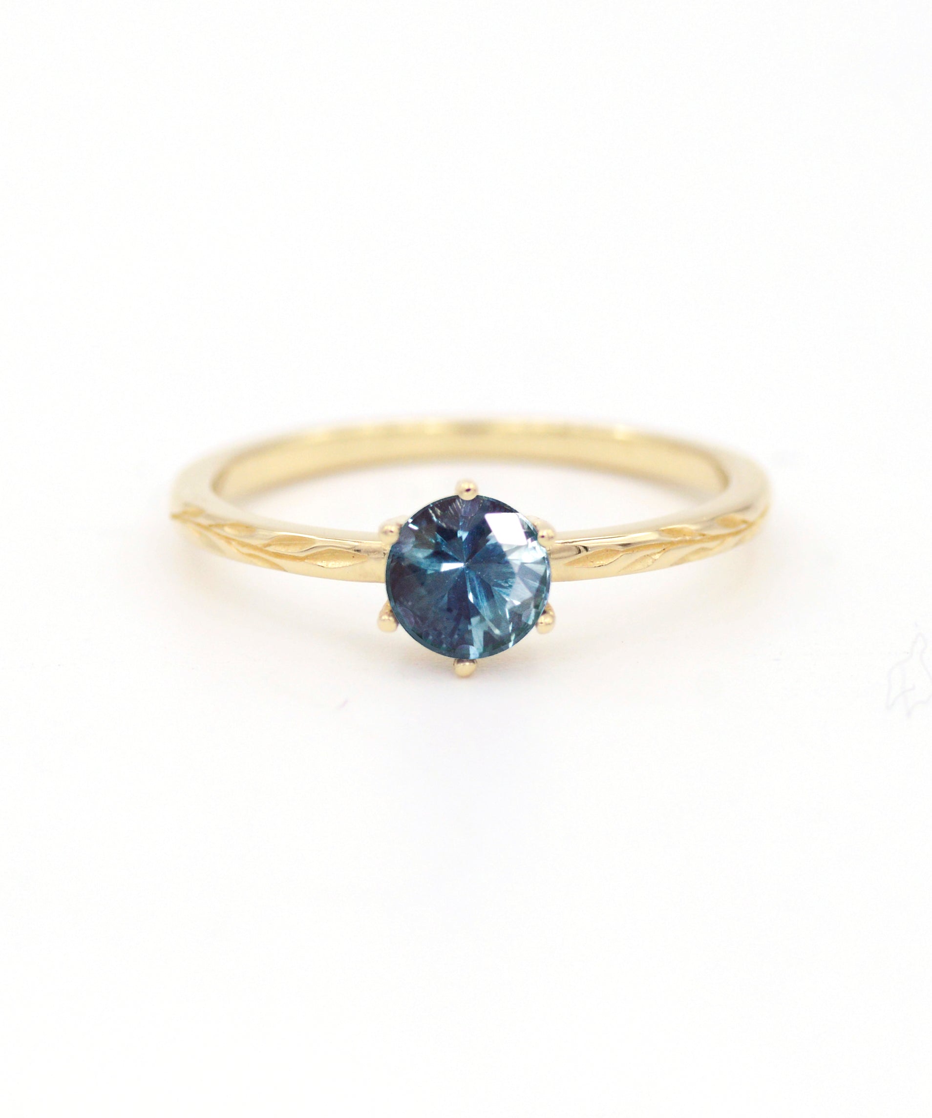 A 5mm round Montana sapphire prong set in a delicate band with olive branch engravings on either side.