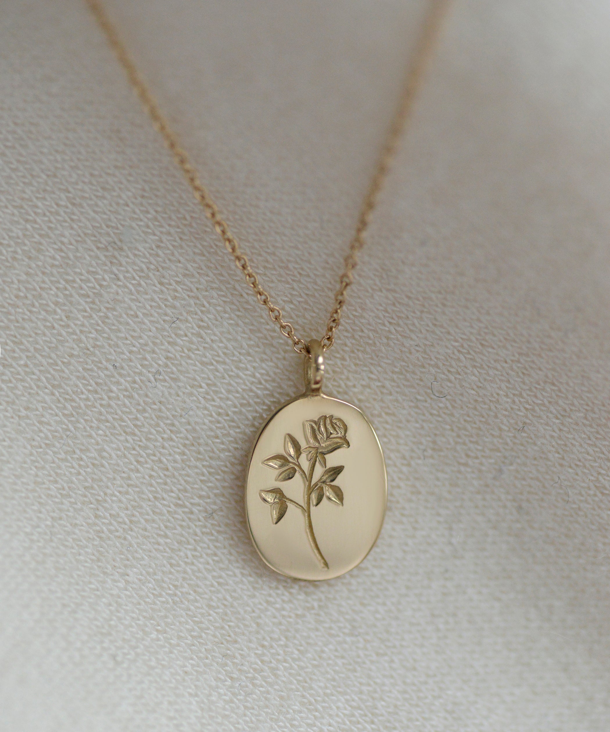 A dainty everyday necklace, perfect for layering. Engraved with a garden rose.
