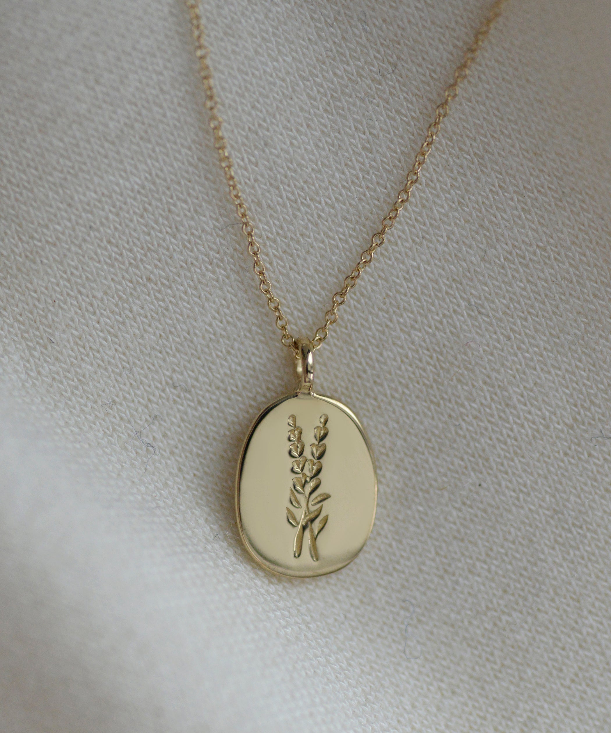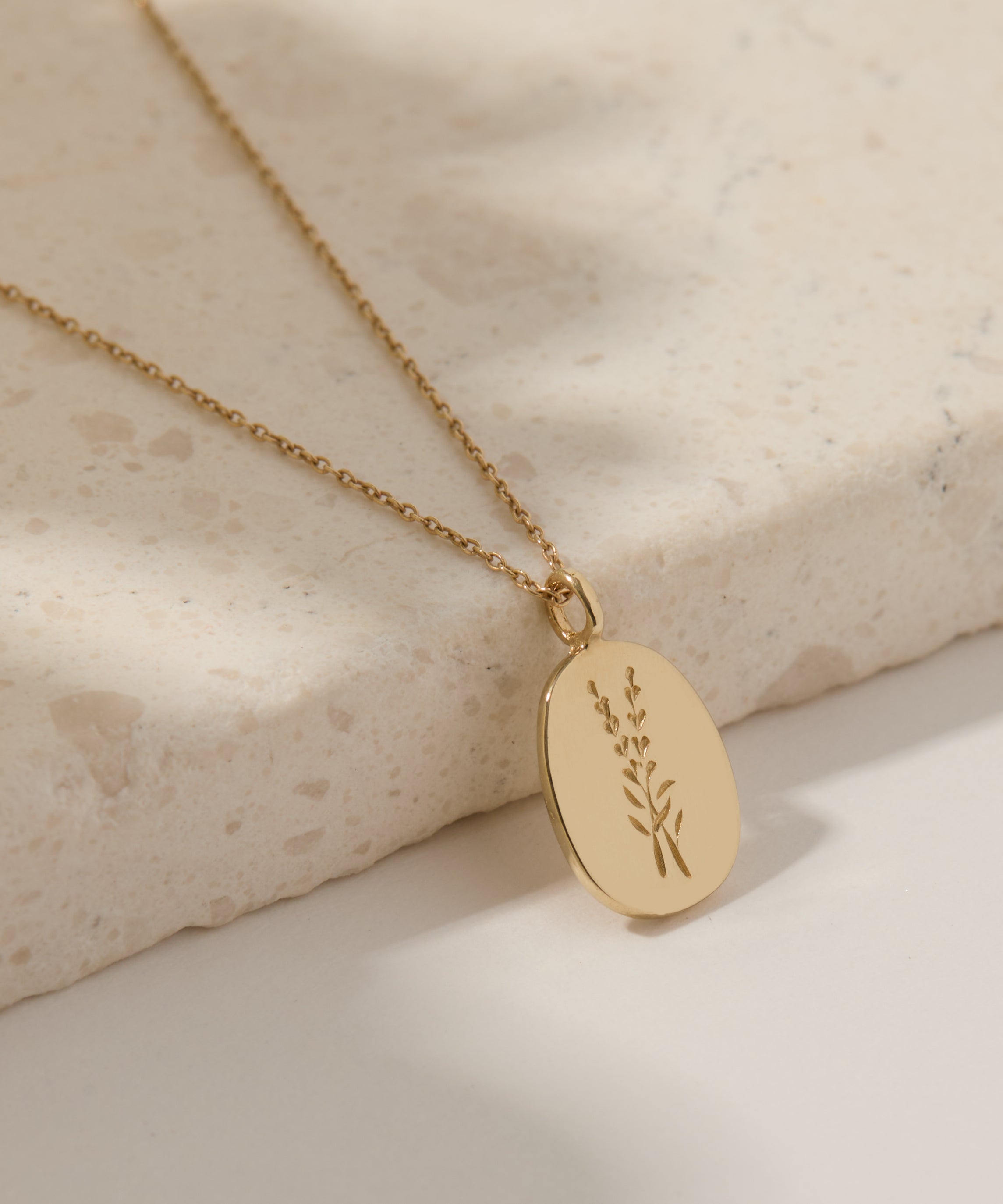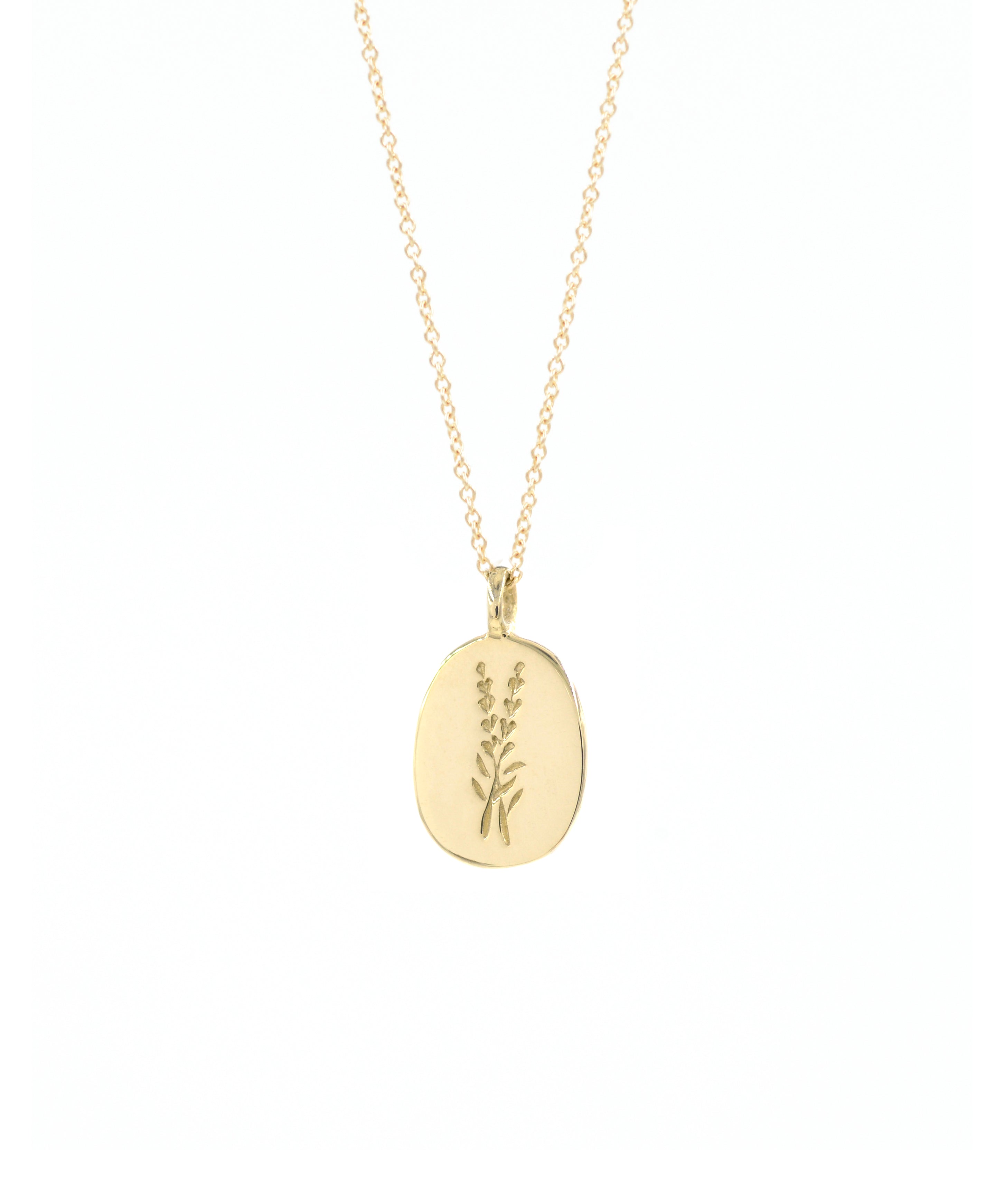 A dainty everyday necklace, perfect for layering. Engraved with two sprigs of lavender.