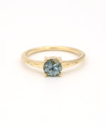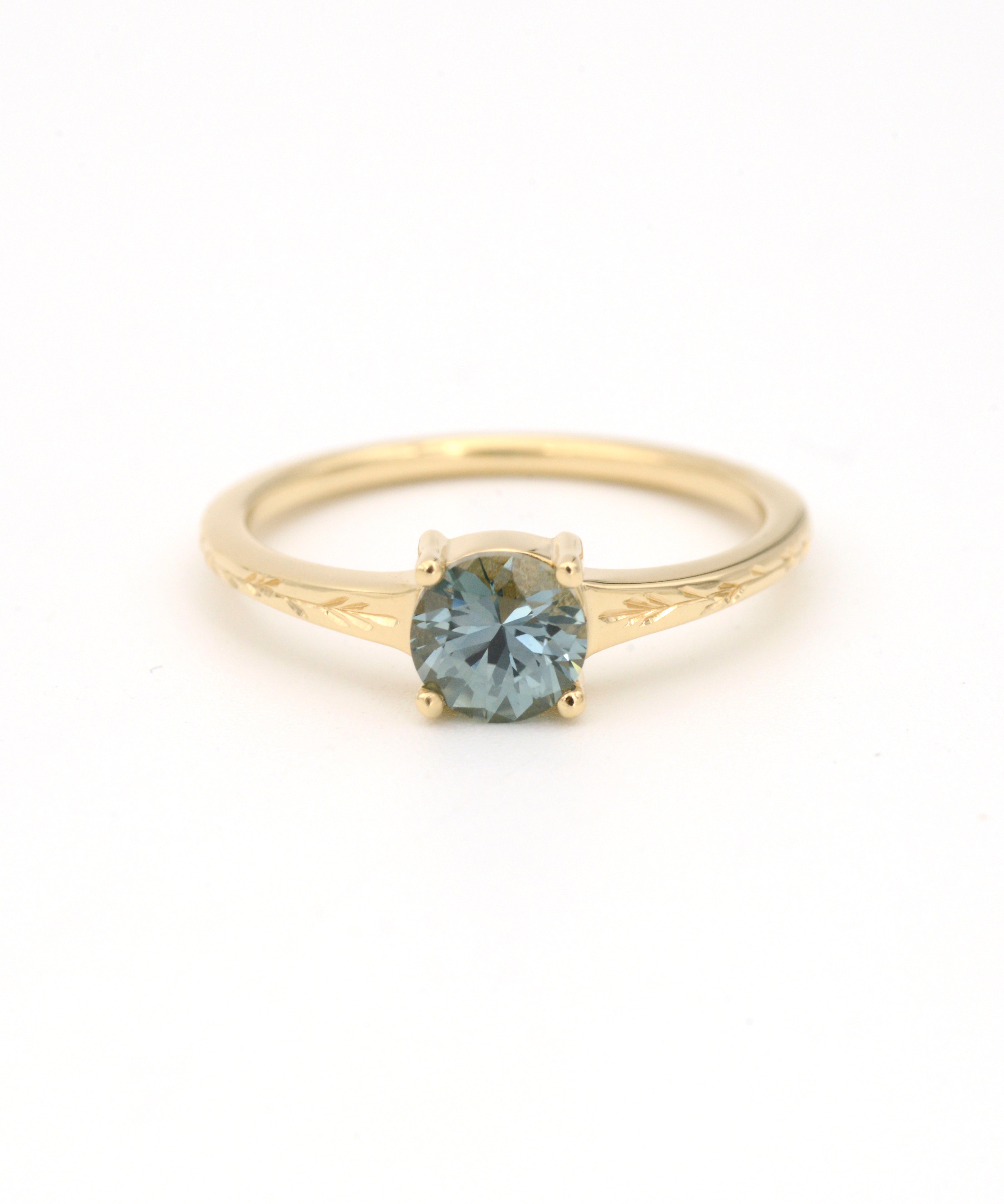 This Ava Ring is set with a one of a kind, medium teal 5.5mm round sapphire in a 14k yellow gold tapered band with leafy sprigs hand engraved on either side.