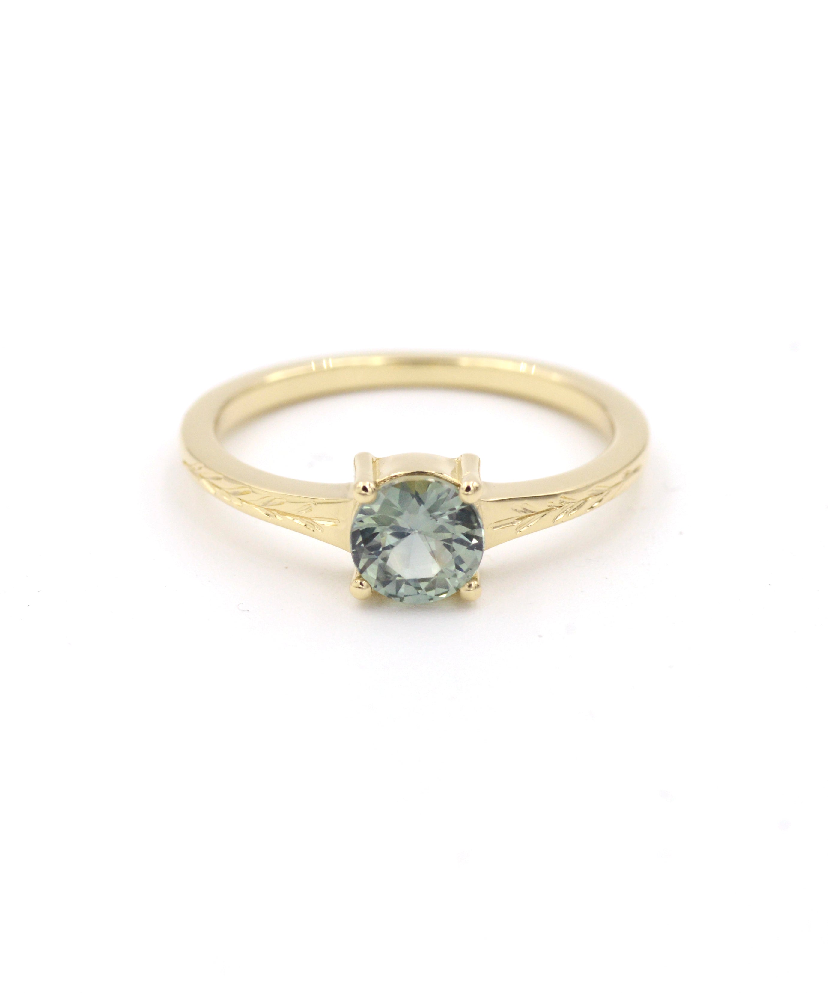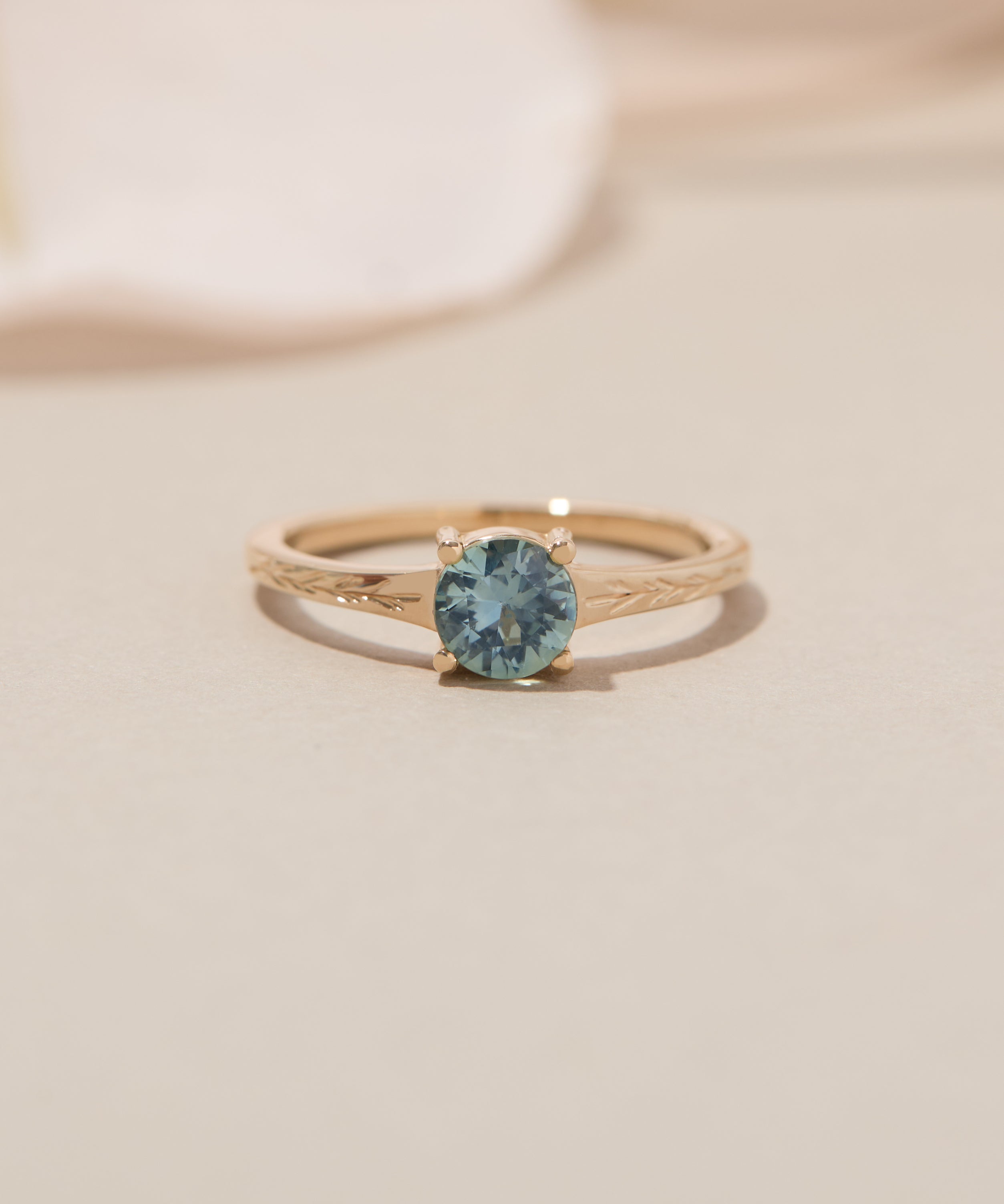 This Ava Ring is set with a one of a kind, light teal 5.5mm round sapphire in a 14k yellow gold tapered band with rosemary sprigs hand engraved on either side.