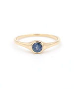This Eve Ring is set with a one of a kind, 4mm blue Montana sapphire in a low profile, signet style bezel in recycled 14k yellow gold.