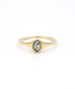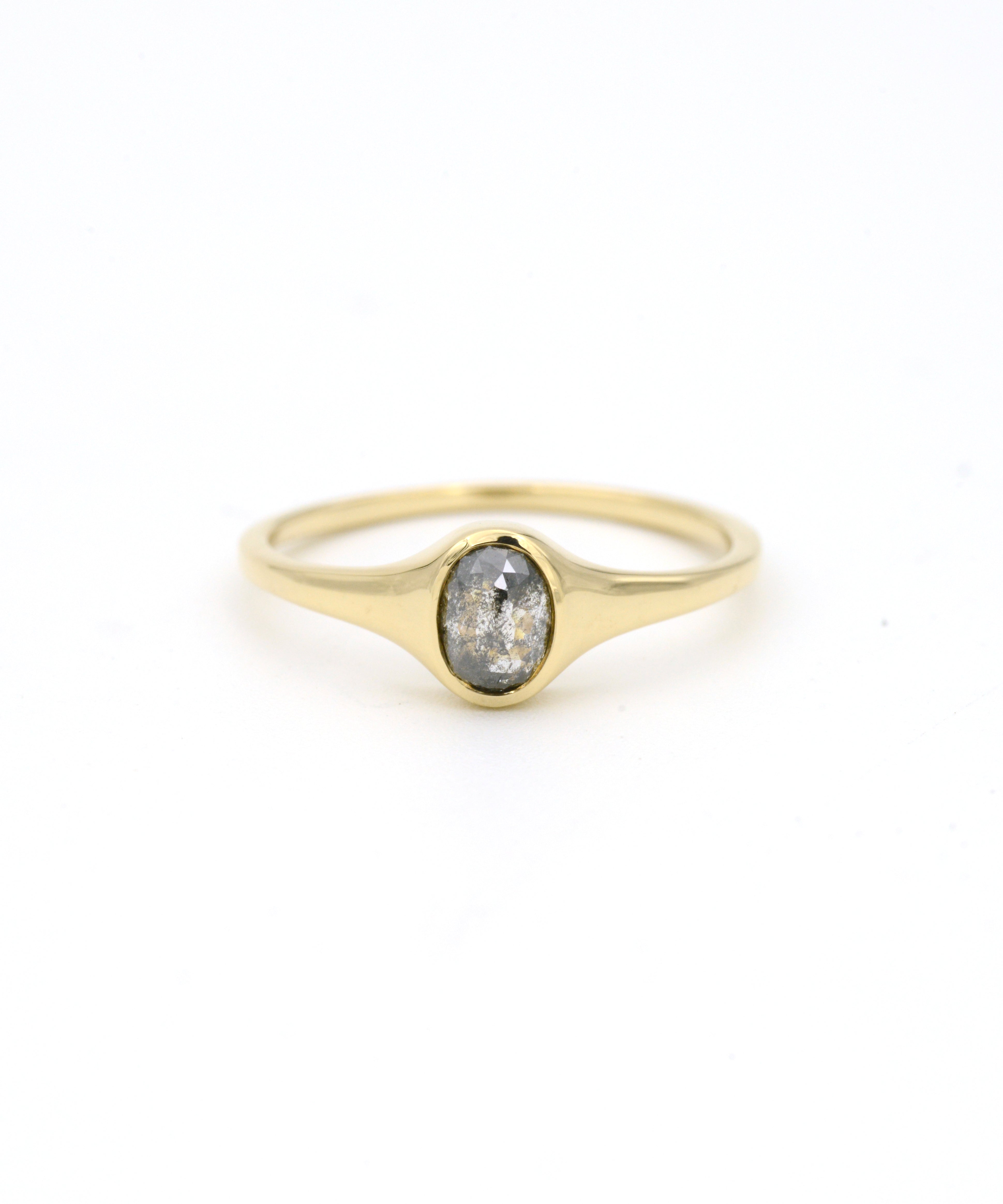 This Florence Ring is set with a one of a kind, 5x4mm salt and pepper rose cut diamond, signet style bezel in recycled 14k yellow gold.