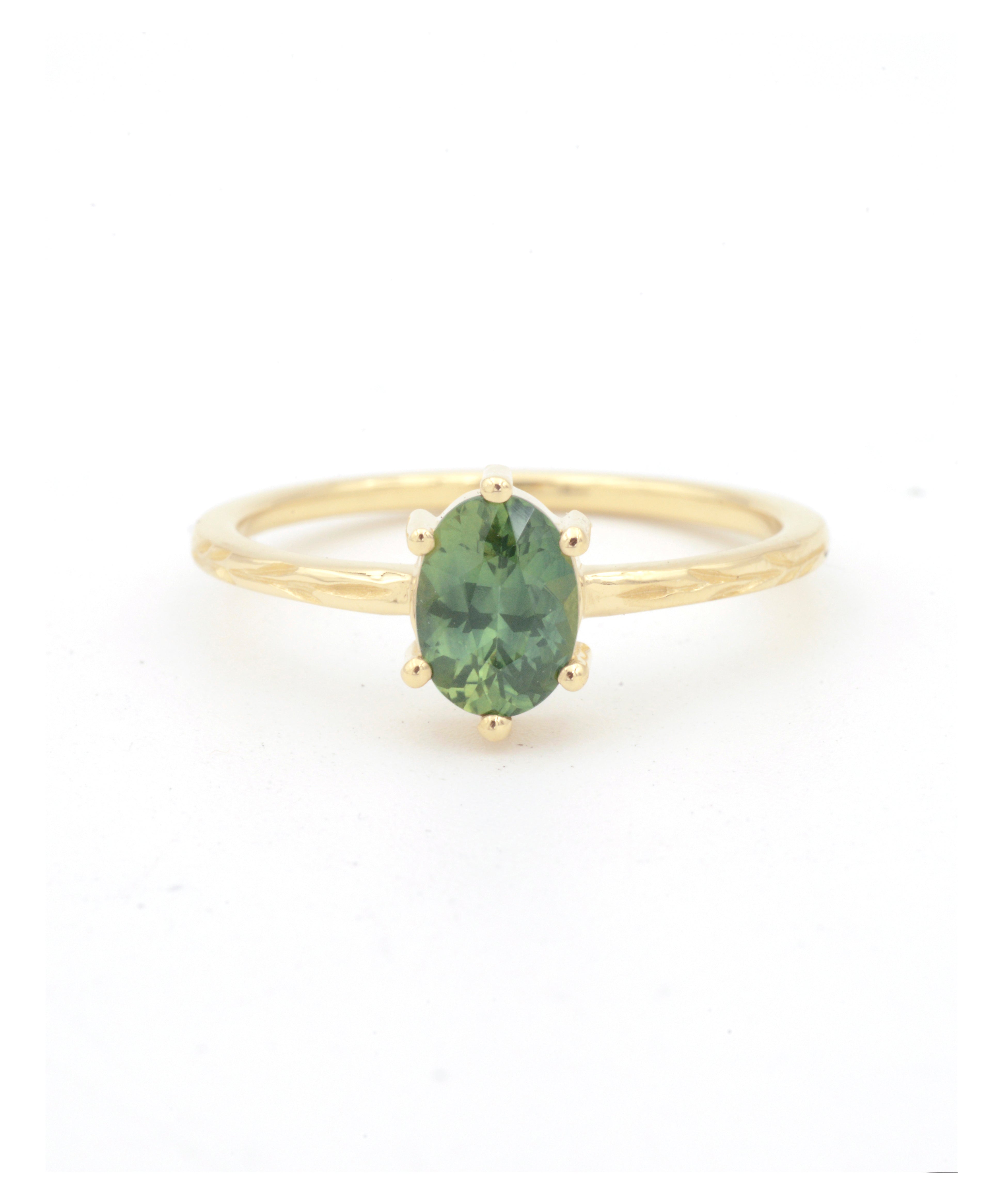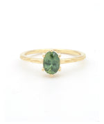 This Maren Ring is set with a one of a kind oval brilliant cut Australian sapphire in a delicate 14k yellow gold band with olive branch engravings on either side.