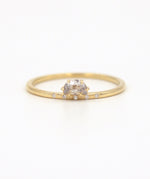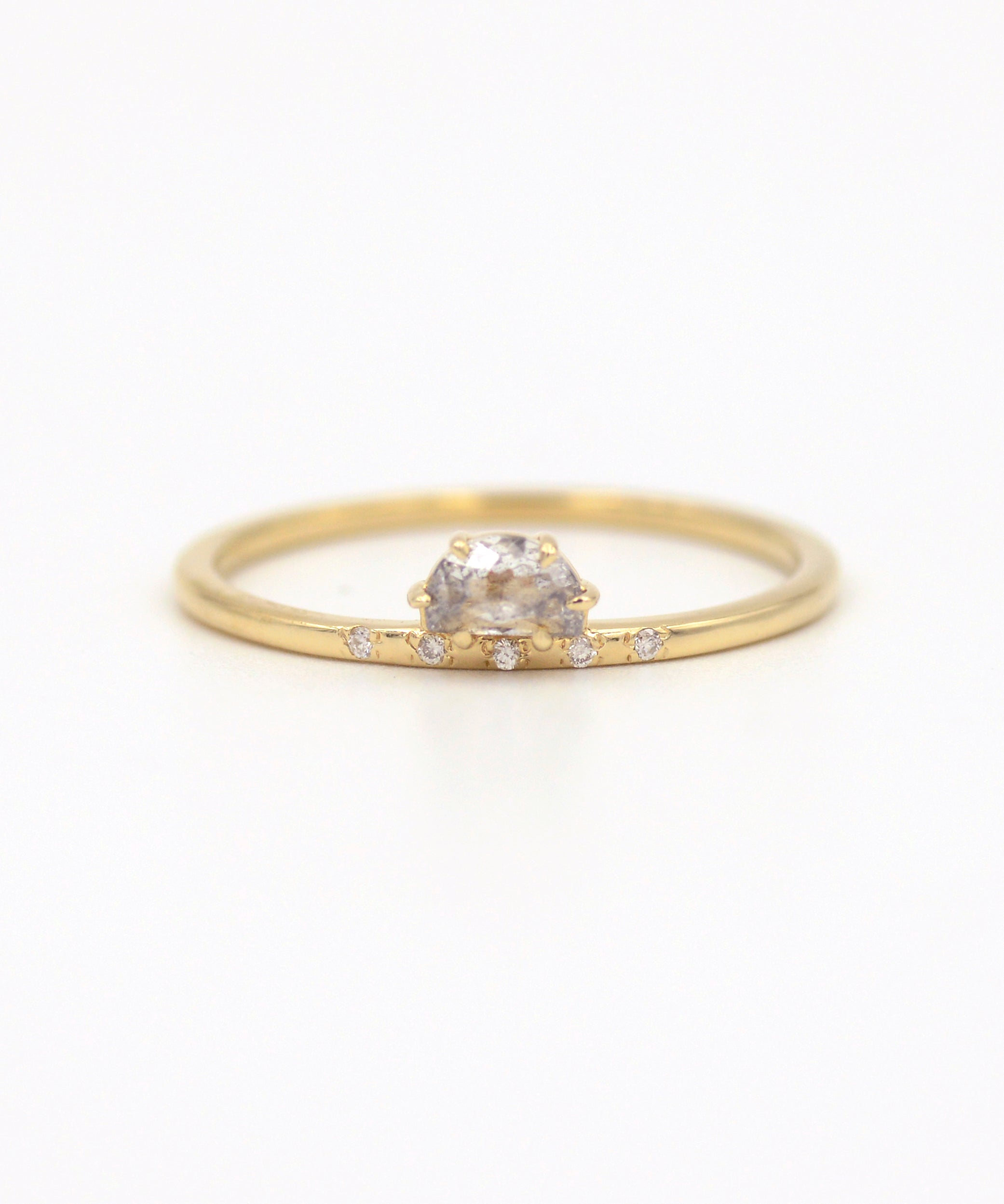 A .22ct half moon salt and pepper diamond sits atop a 14k yellow gold band. Pavé set with 5 white diamonds.