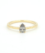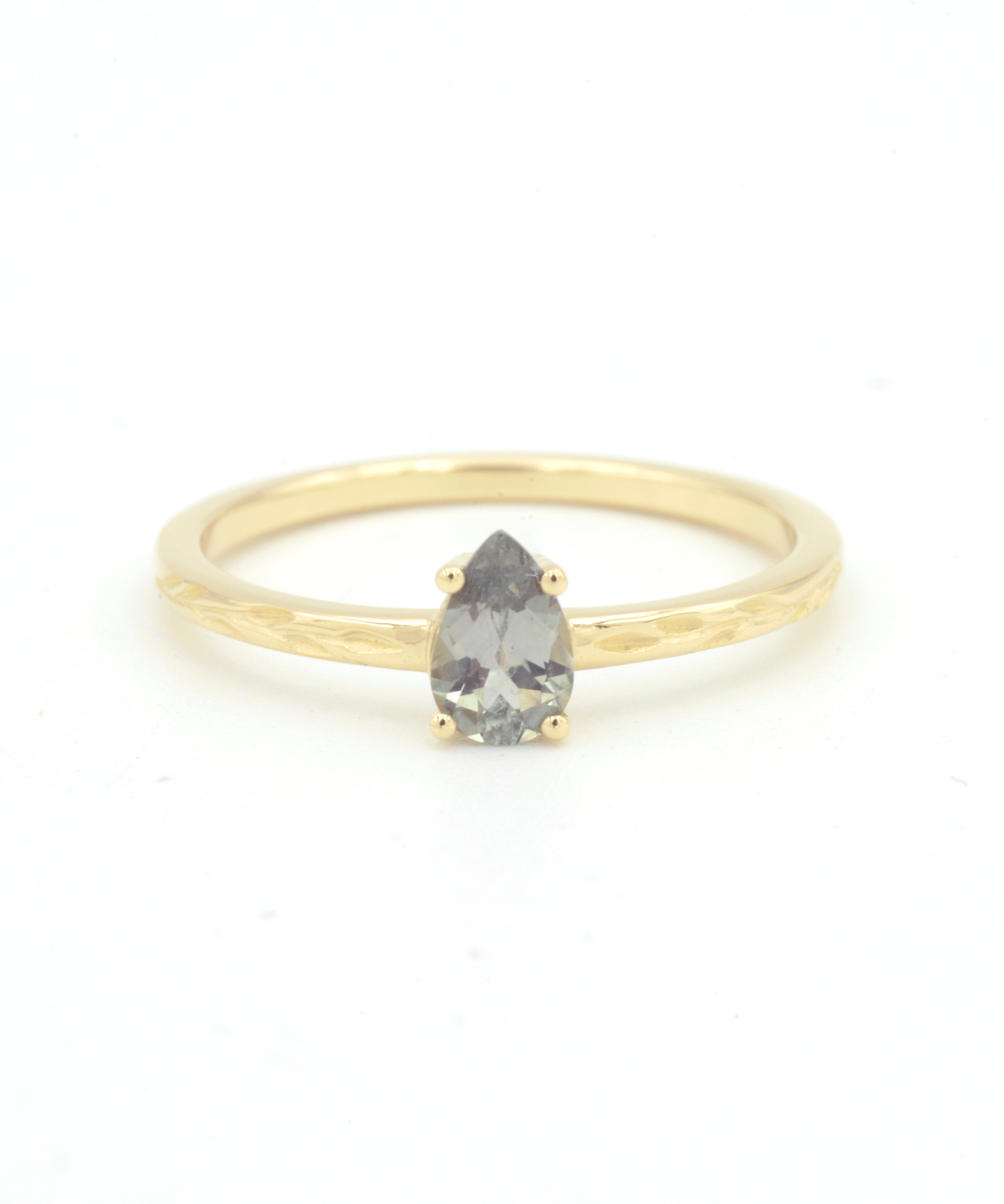 This Nami Ring is set with a one of a kind 6x4mm gray-green pear shaped Montana sapphire in a 14k yellow gold band with olive branch engravings on either side.