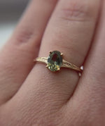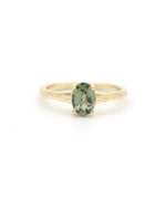 This Fae Ring is set with a one of a kind, medium green 7x5mm oval Montana sapphire in a 14k yellow gold tapered band with leafy sprigs hand engraved on either side.