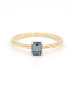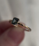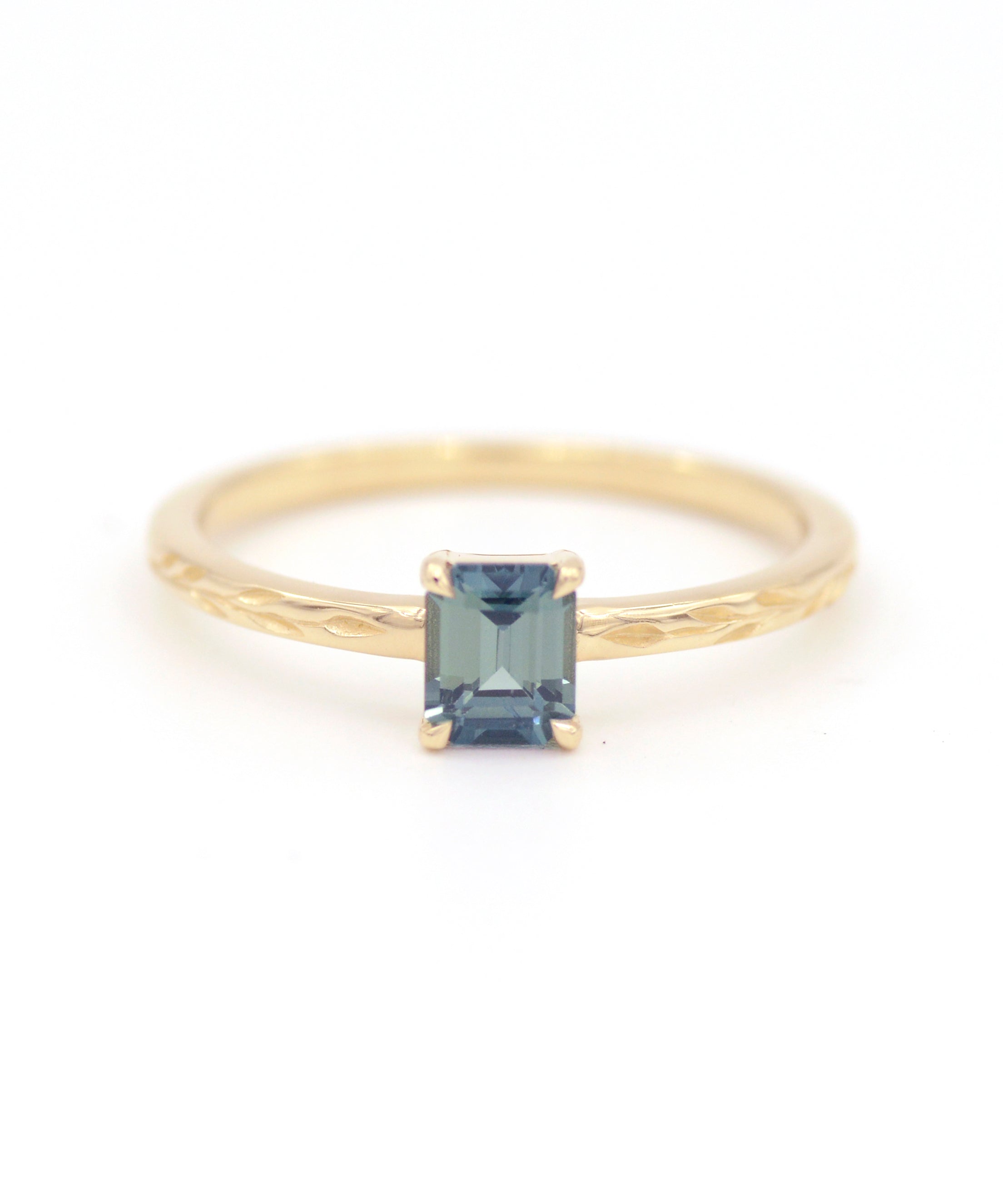 One of a Kind .54ct emerald cut, opalescent blue-green Australian sapphire prong set in a delicate 14k yellow gold band with olive branch engravings.
