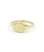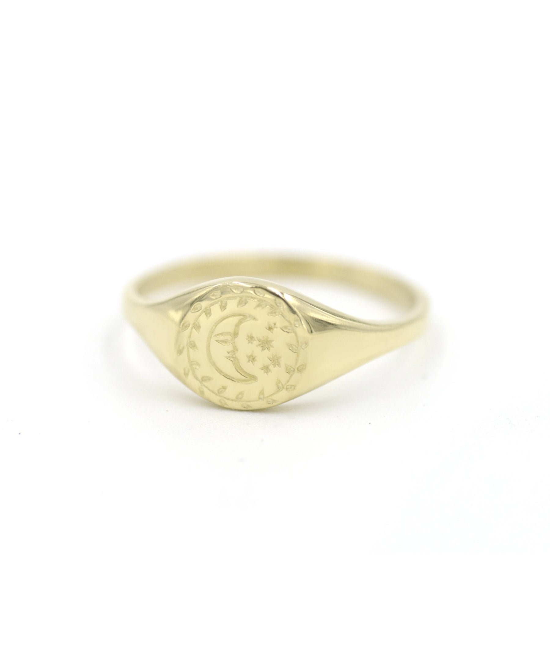 A low profile, circular shaped signet ring. Hand engraved with a crescent moon and laurel border.