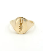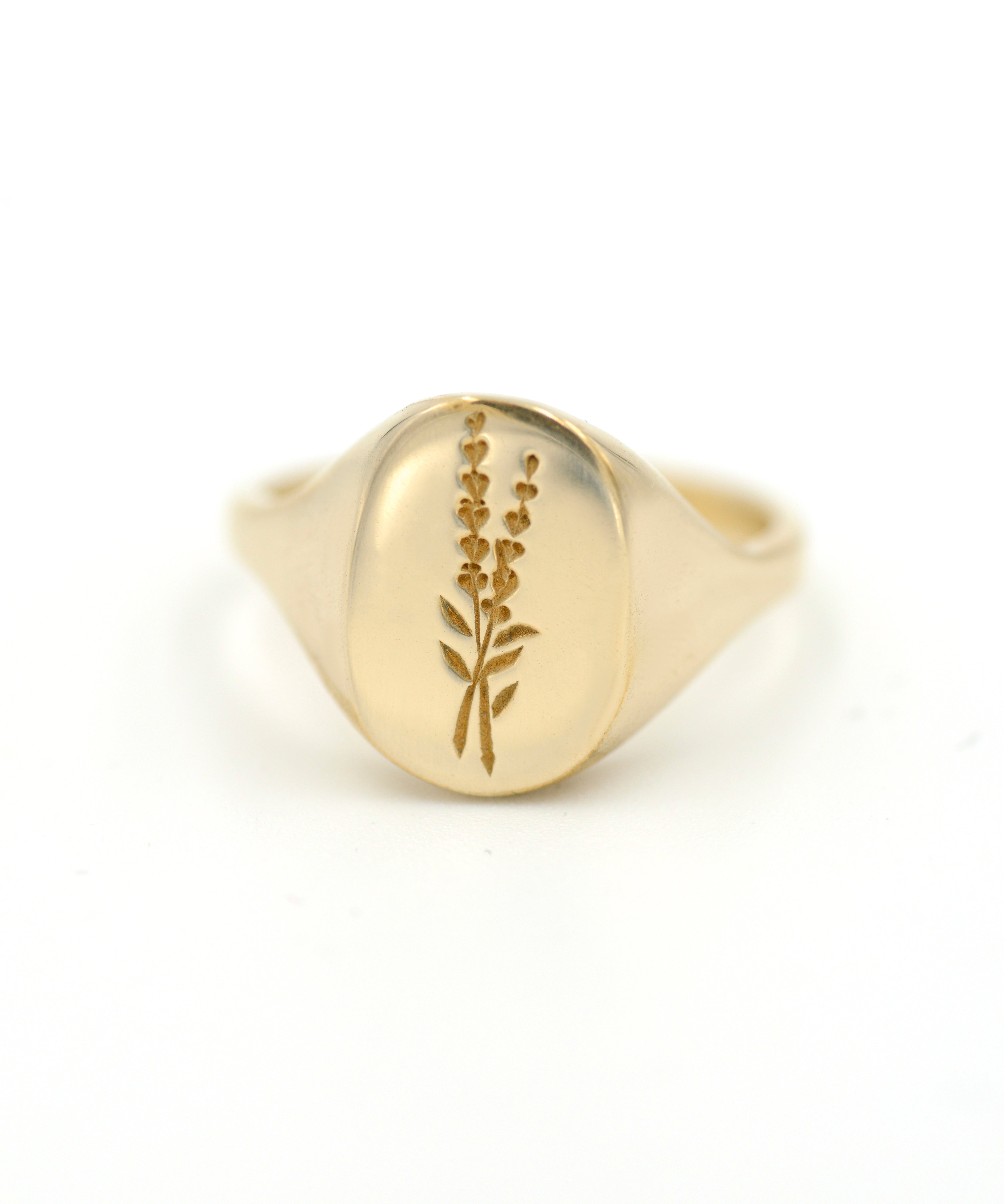 Our classic oval signet ring, a bold face with a dainty band, engraved with two sprigs of lavender.