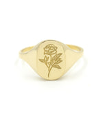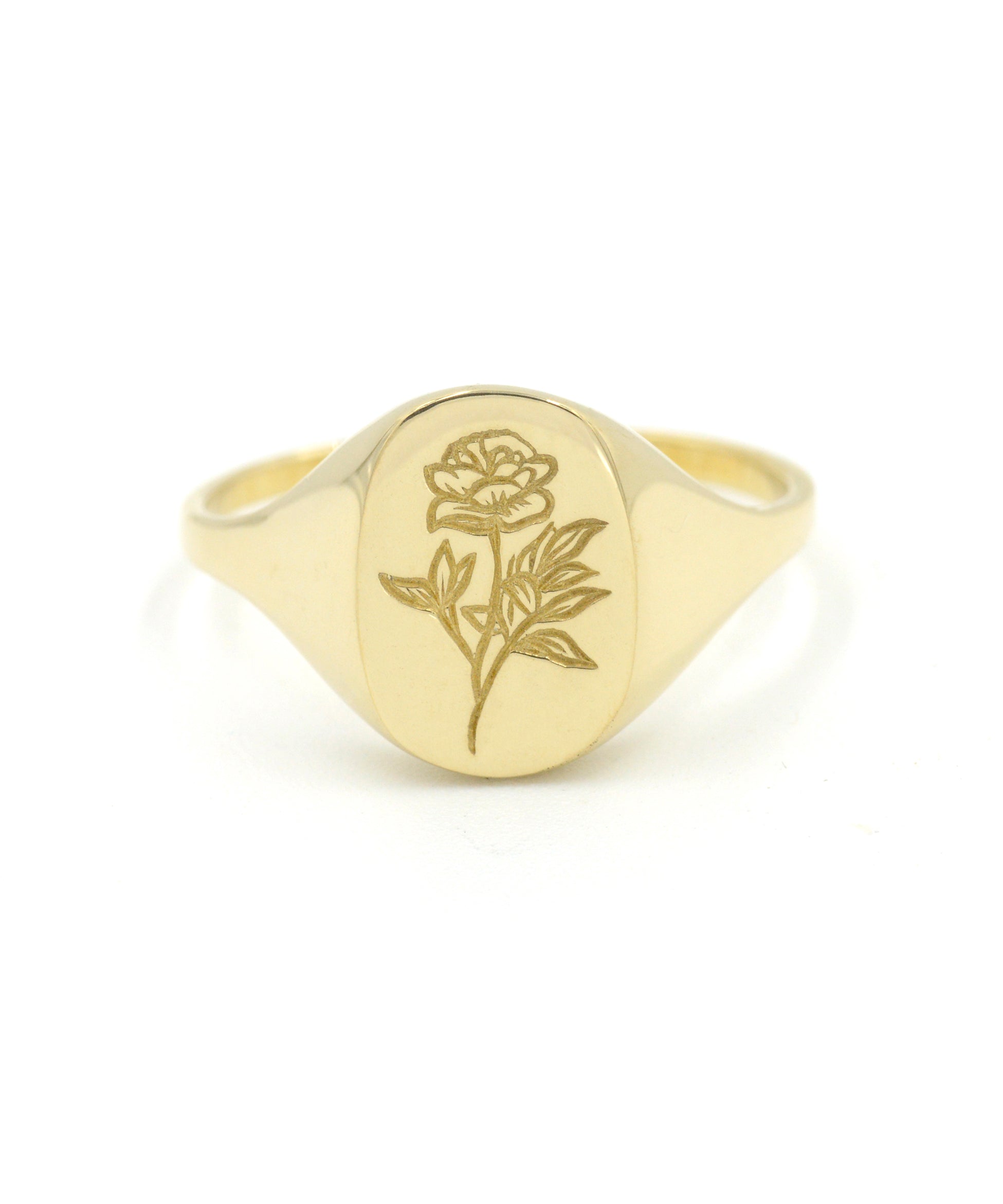 Our classic oval signet ring, a bold face with a dainty band, engraved with a peony flower.