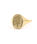 Our classic oval signet ring, a bold face with a dainty band, engraved with a sunflower.