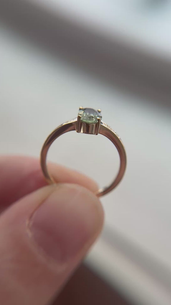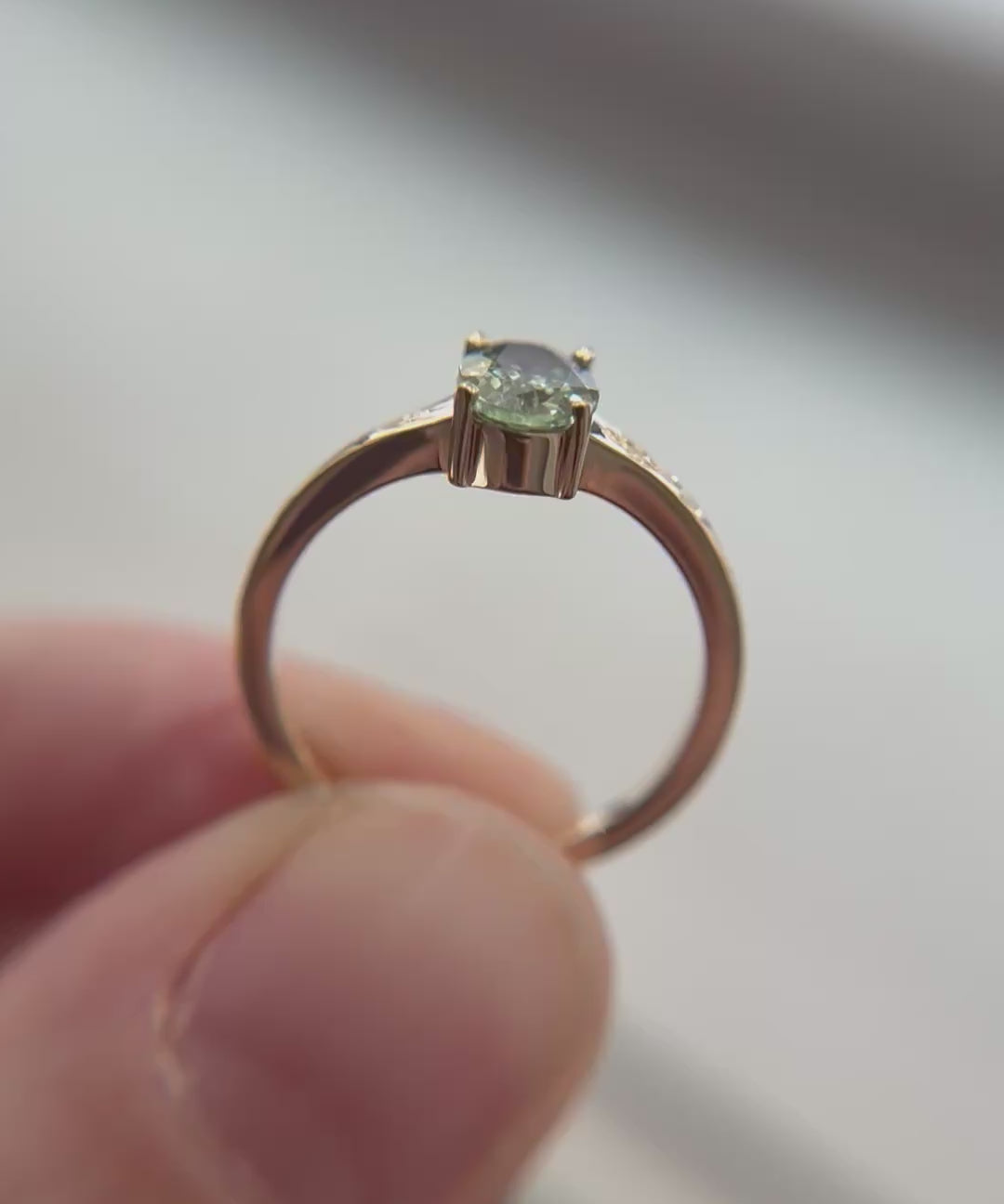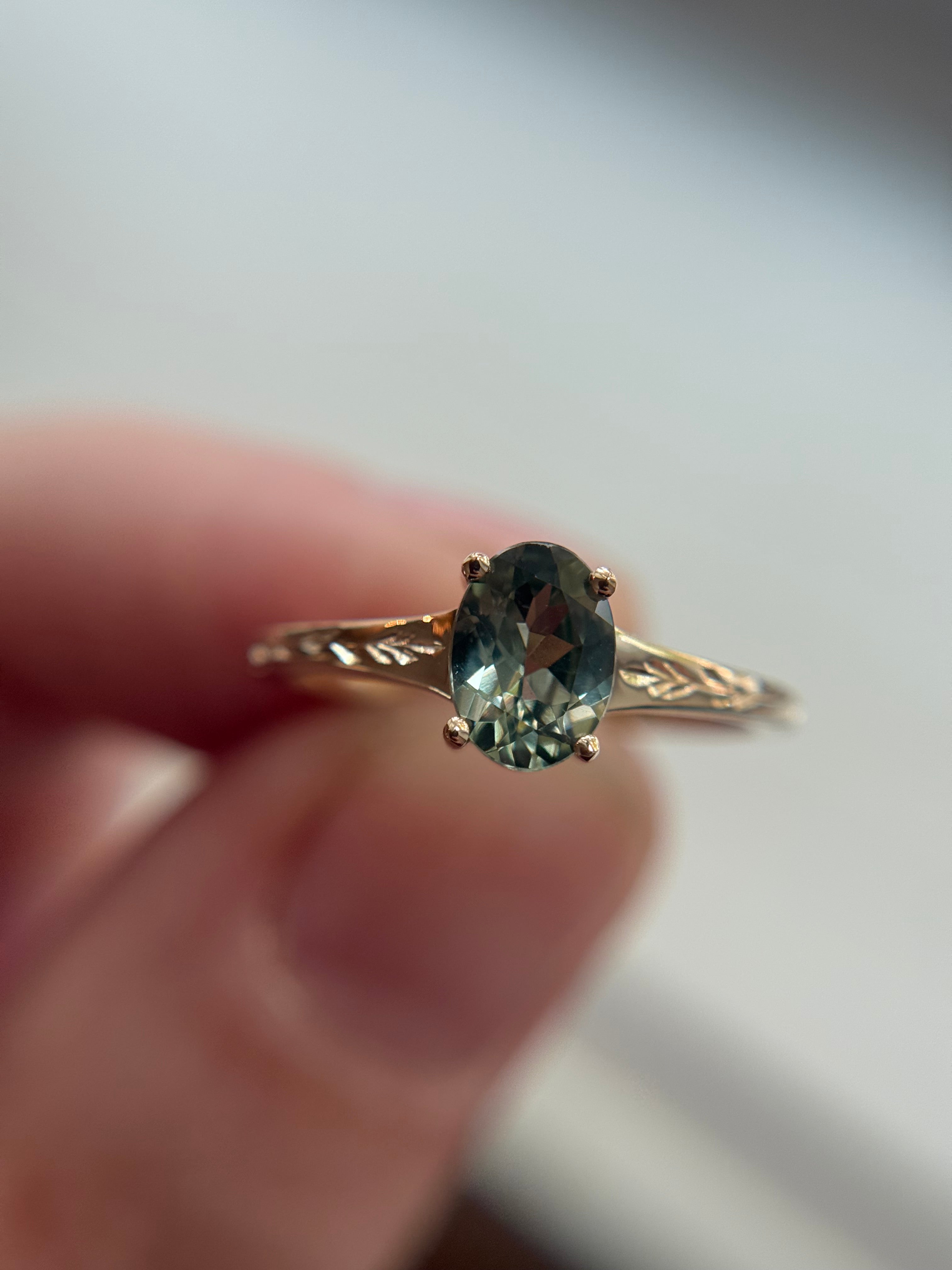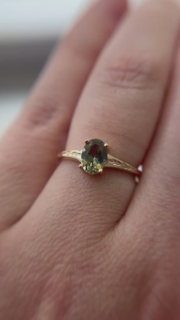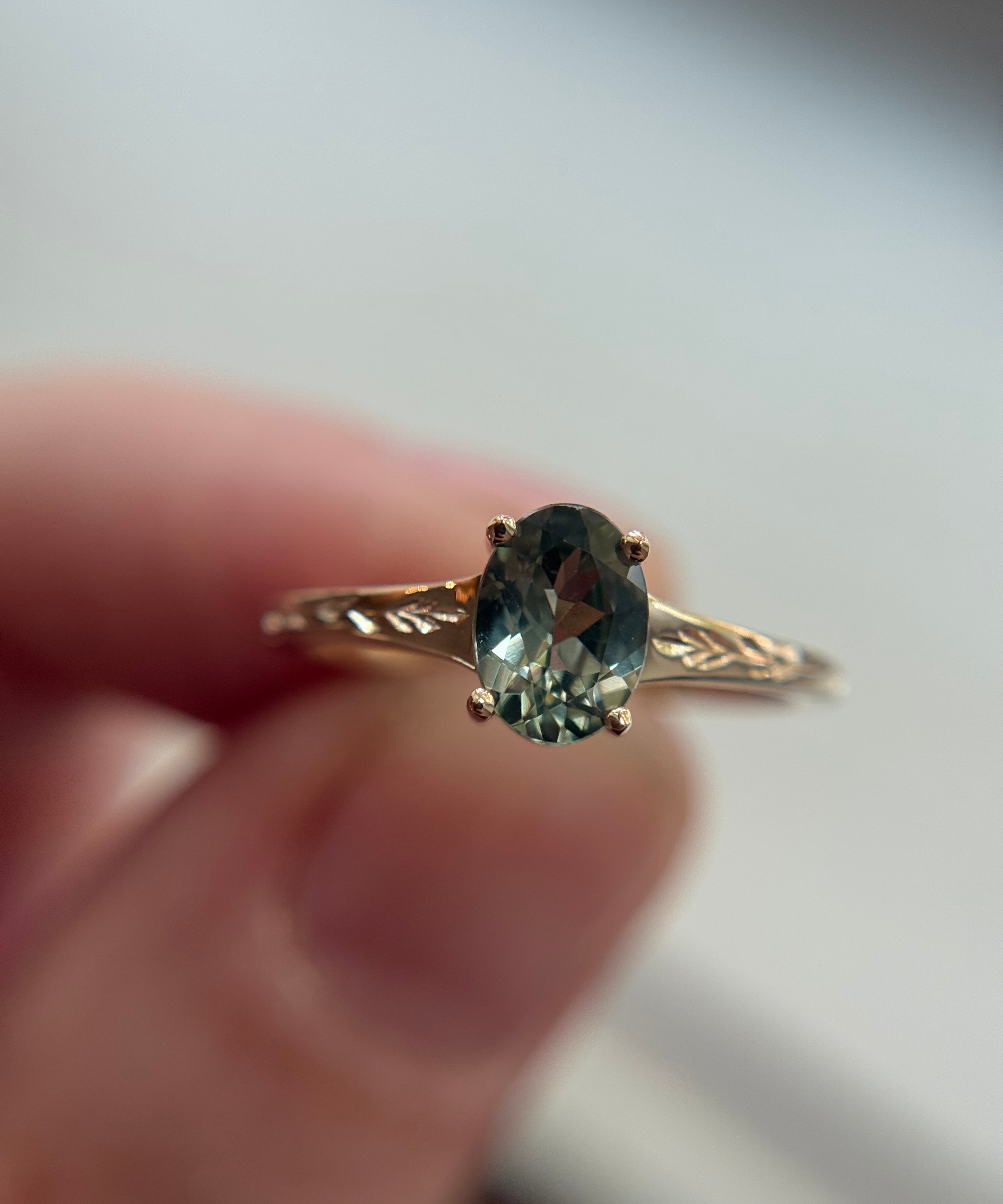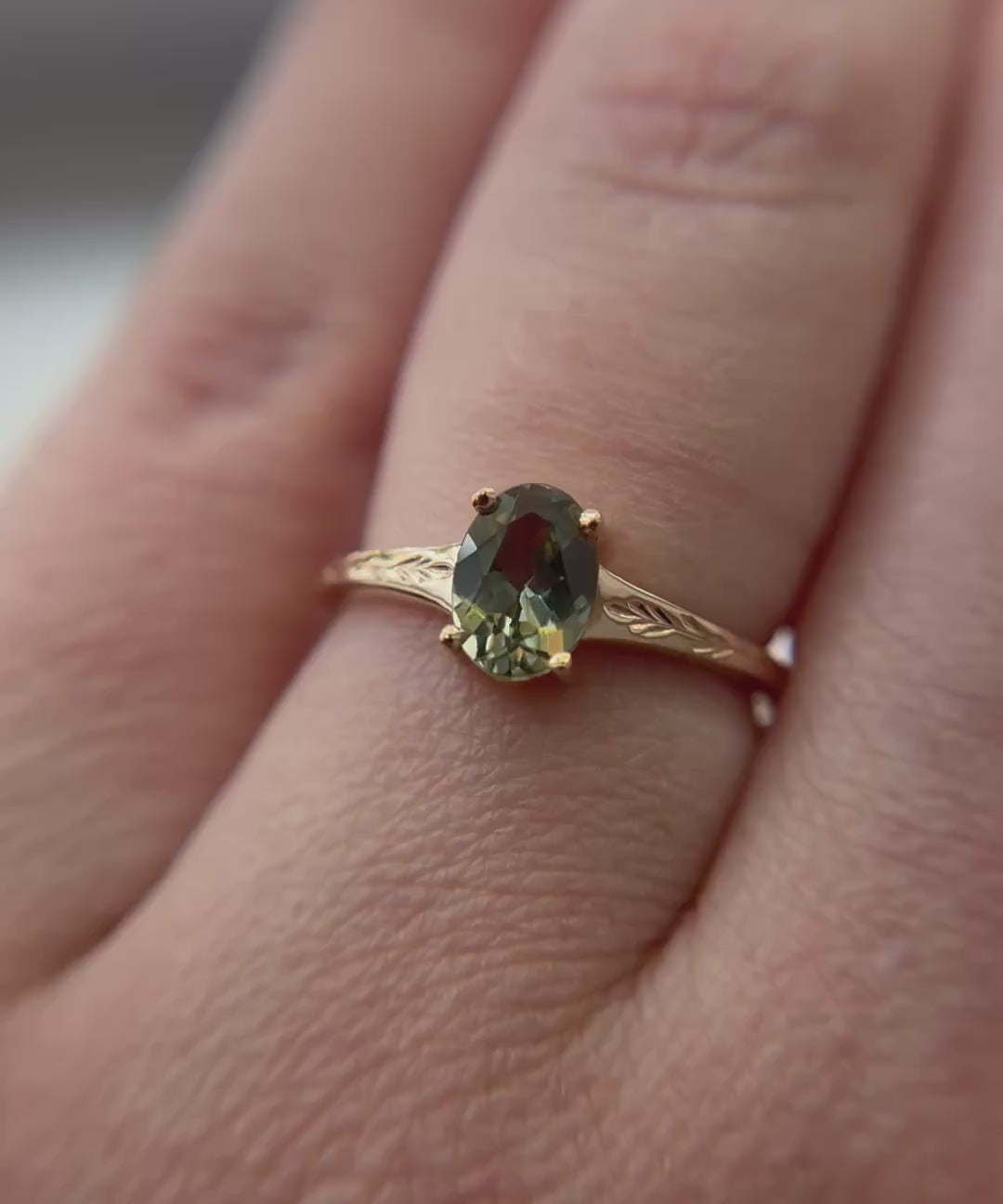 This Fae Ring is set with a one of a kind, medium green 7x5mm oval Montana sapphire in a 14k yellow gold tapered band with leafy sprigs hand engraved on either side.
